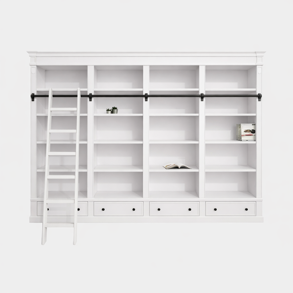 Brighton library - boekenkast - 330x40x240H cm - demontabel - met stang en ladder - 330x40x240H cm - 16 verstelbare planken - 4 soft close lades