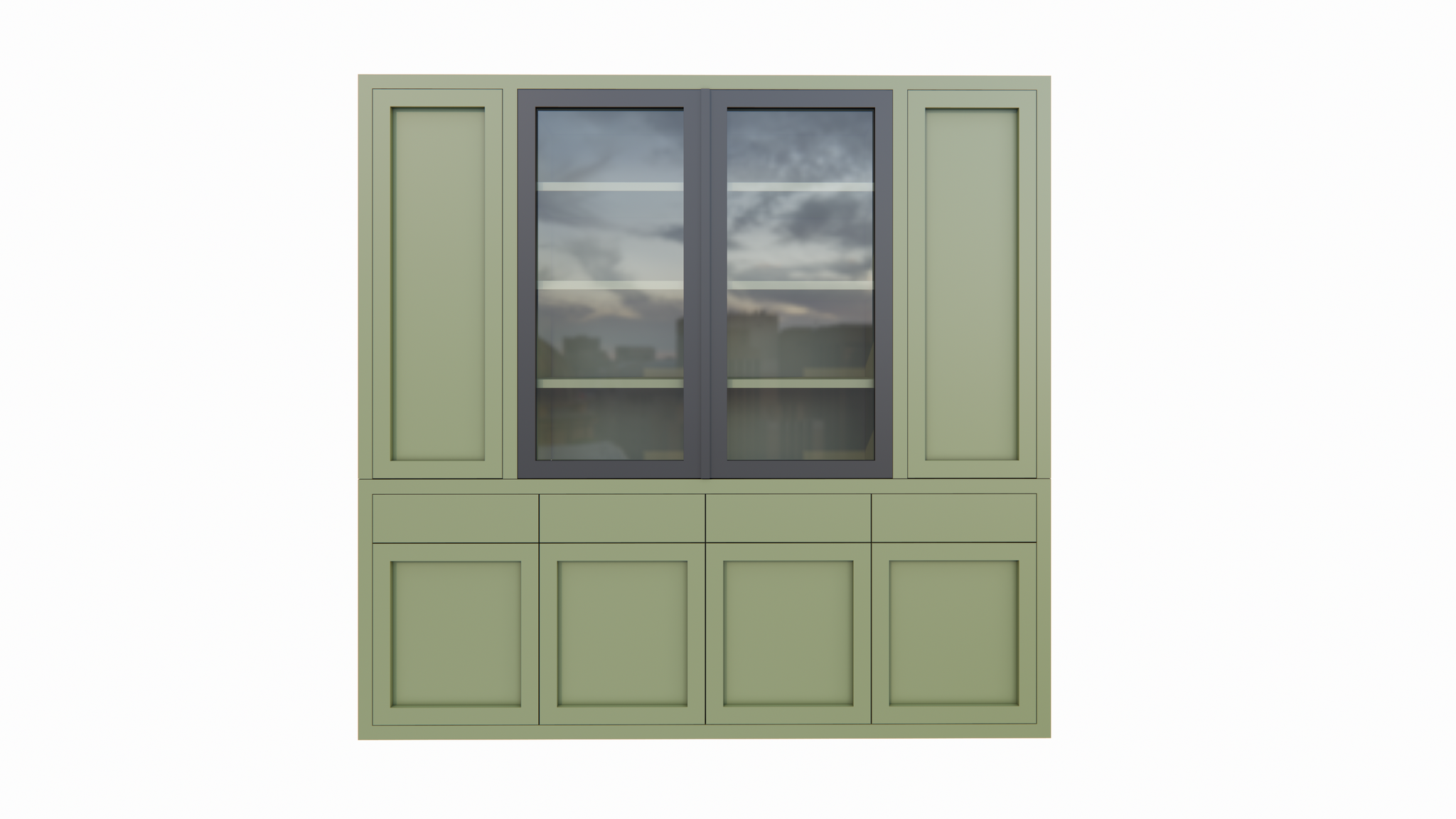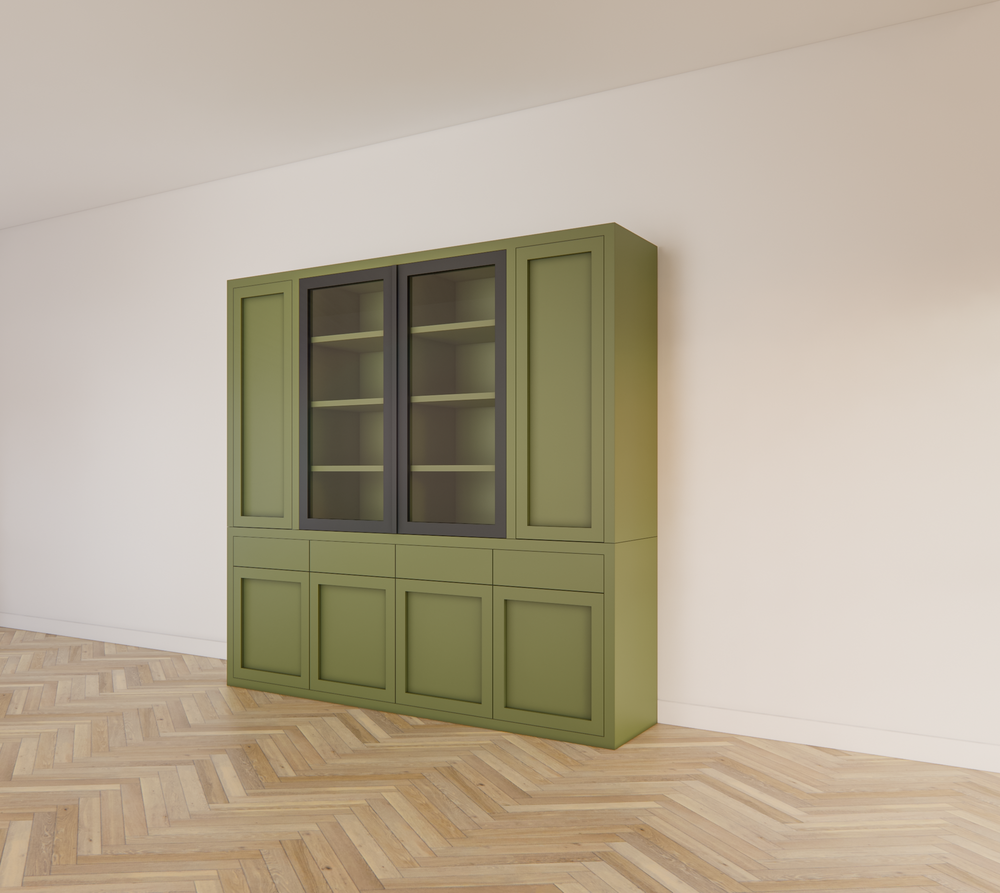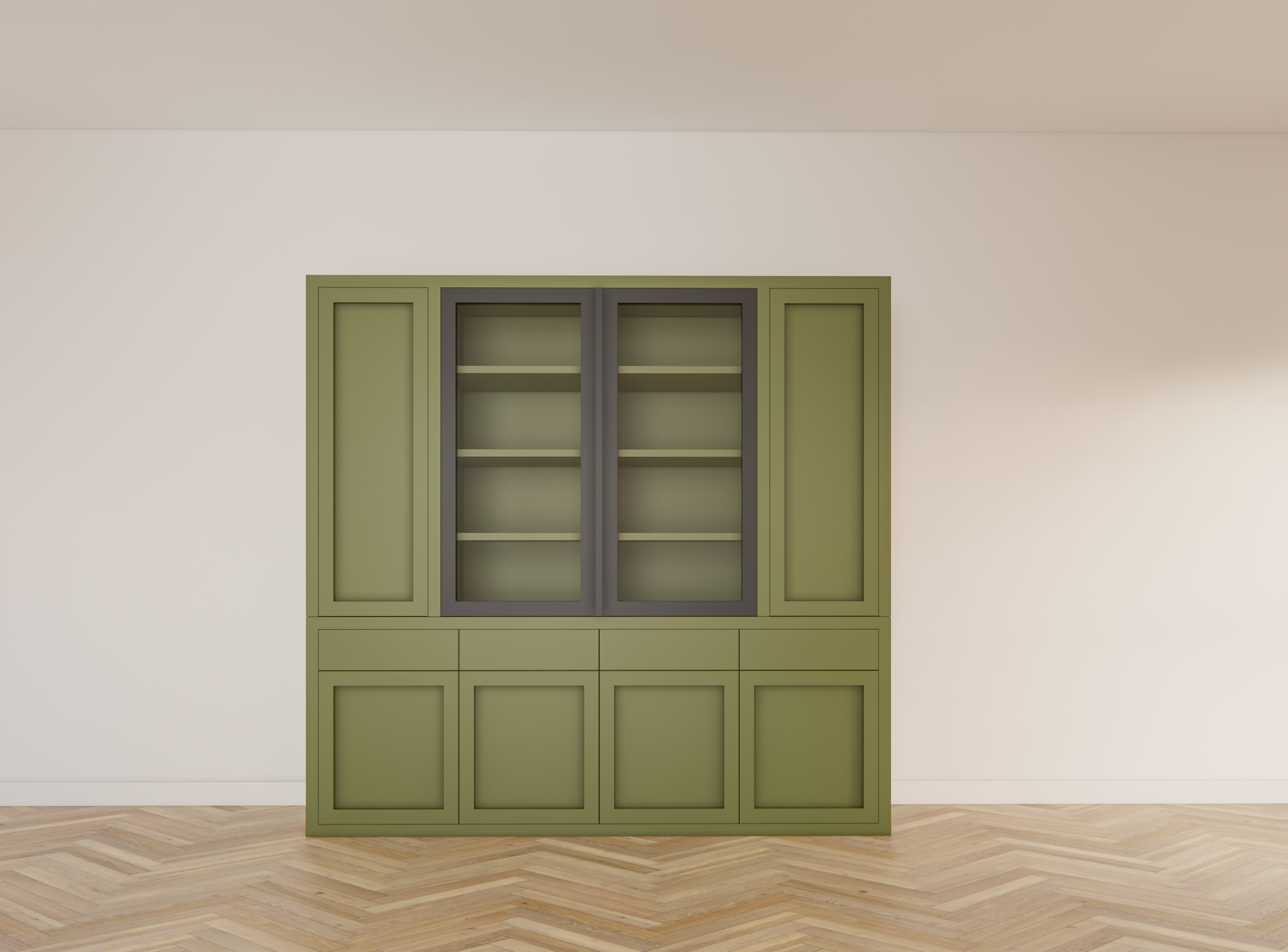 Wat direct opvalt aan de Formia is het minimalistische karakter. Er zijn geen zichtbare grepen of knoppen, want alle deuren en lades werken met een push-to-open systeem. Een lichte druk volstaat om de kast moeiteloos te openen. Dit maakt het geheel rustig, modern en esthetisch perfect in balans. De getoonde uitvoering is gespoten in een warme, natuurlijke groentint, maar je kunt de kast volledig laten uitvoeren in elke gewenste RAL-kleur. Van klassiek zwart tot Scandinavisch wit of juist een gewaagde kleuraccent – alles is mogelijk.