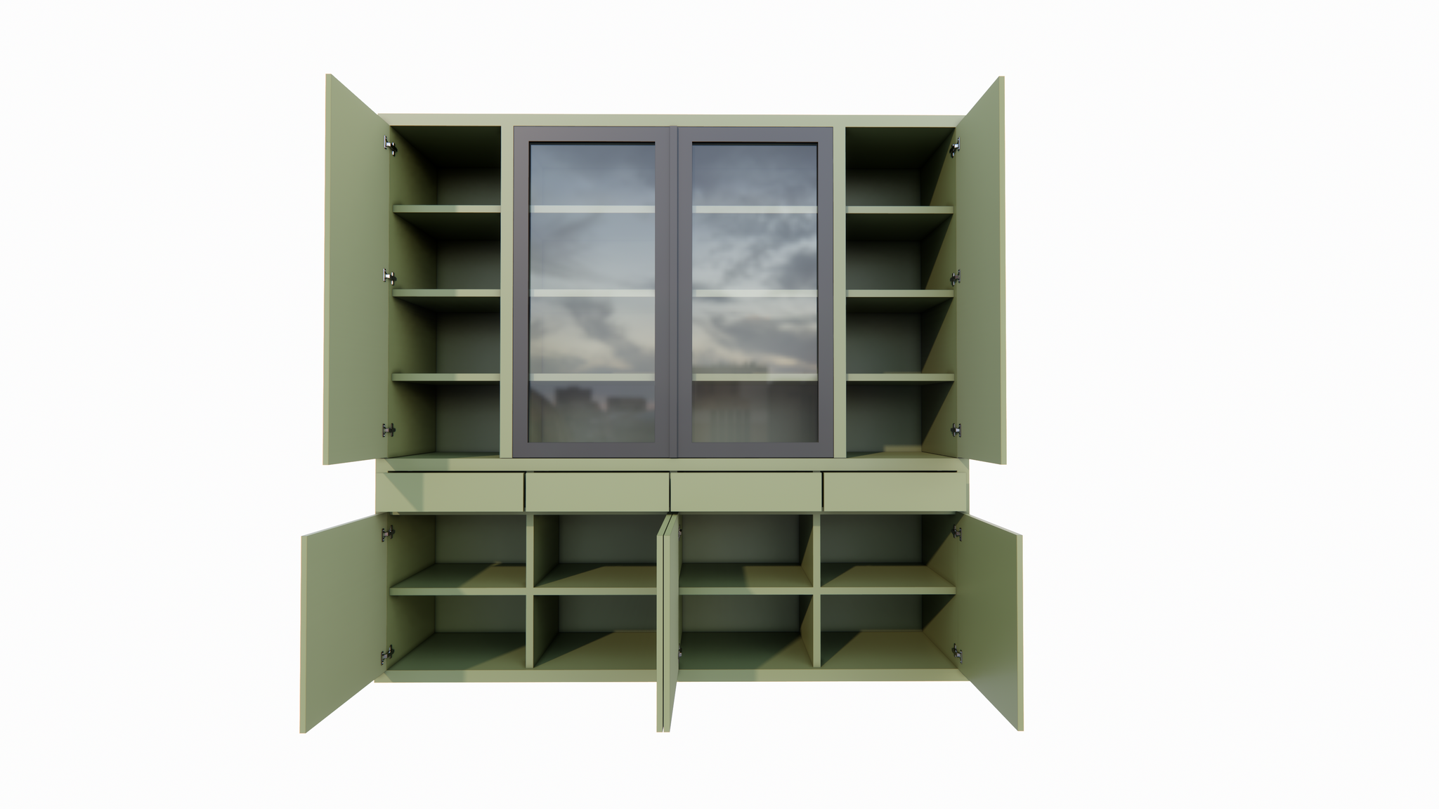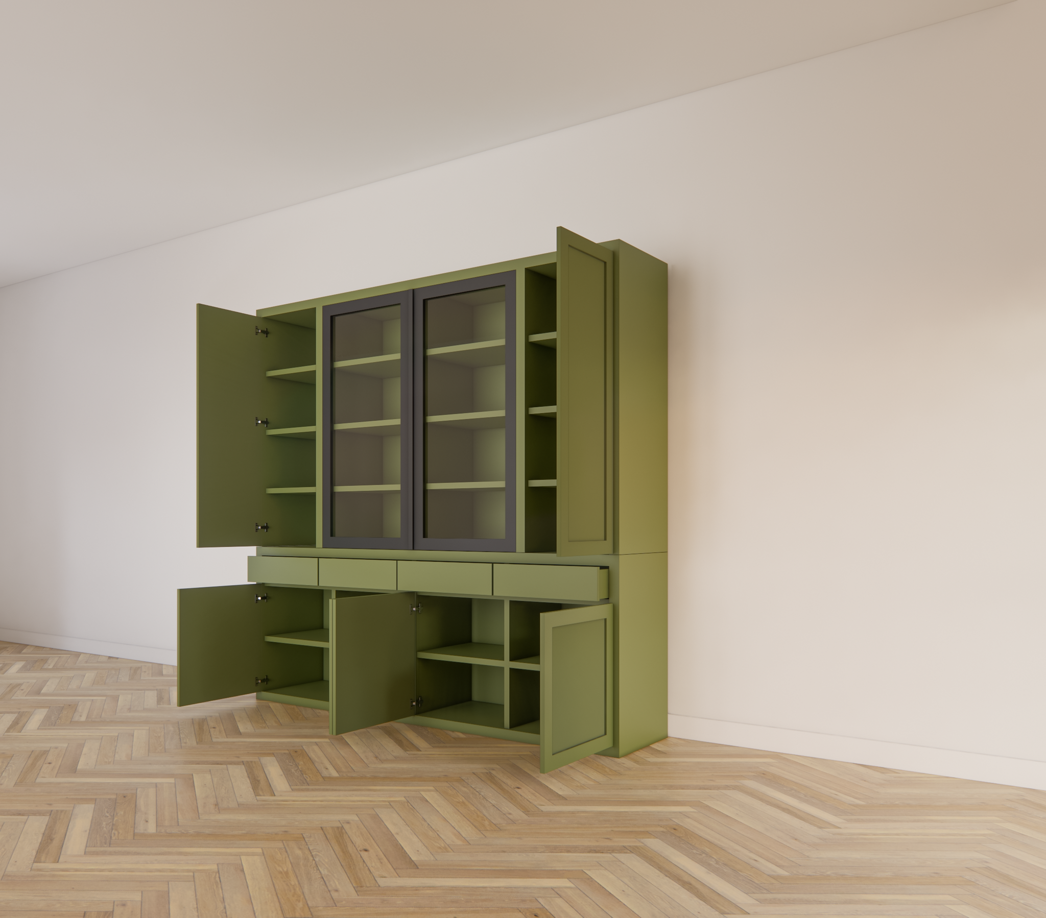 Deze kast voelt zich thuis in allerlei interieurs: van modern tot landelijk, van industrieel tot Japandi. In een leefkeuken komt hij perfect tot zijn recht als servieskast of voorraadkast, in de woonkamer als stijlvol opbergmeubel en vitrinekast in één. Ook in kantoren of studio’s kan hij dienen als een functioneel en representatief meubelstuk.