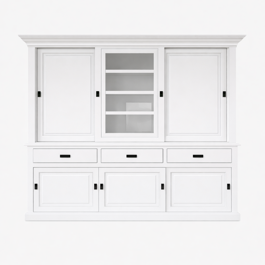 De dichte deuren en schuifdeuren houden je servies en andere items netjes verborgen, terwijl de glazen schuifdeur in het midden een perfecte showcase biedt voor je meest waardevolle stukken. Met drie soft close lades geniet je van moeiteloos openen en sluiten, terwijl de prachtige afwerking een vleugje luxe toevoegt aan elke ruimte.