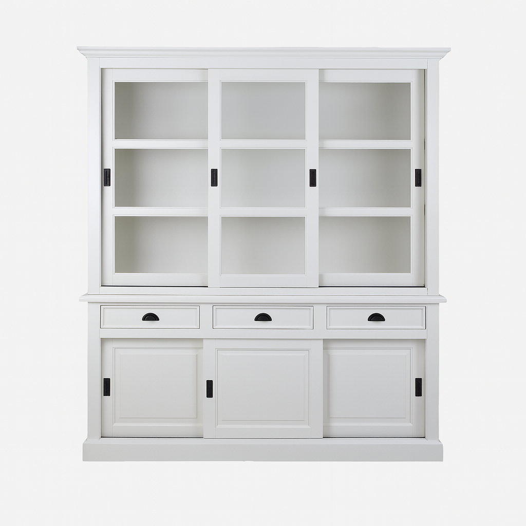 Buffetkast South Hampton - 180x51x220H cm - 3 vitrine schuifdeuren - 3 soft close lades - 3 dichte schuifdeuren - glazen zijkanten