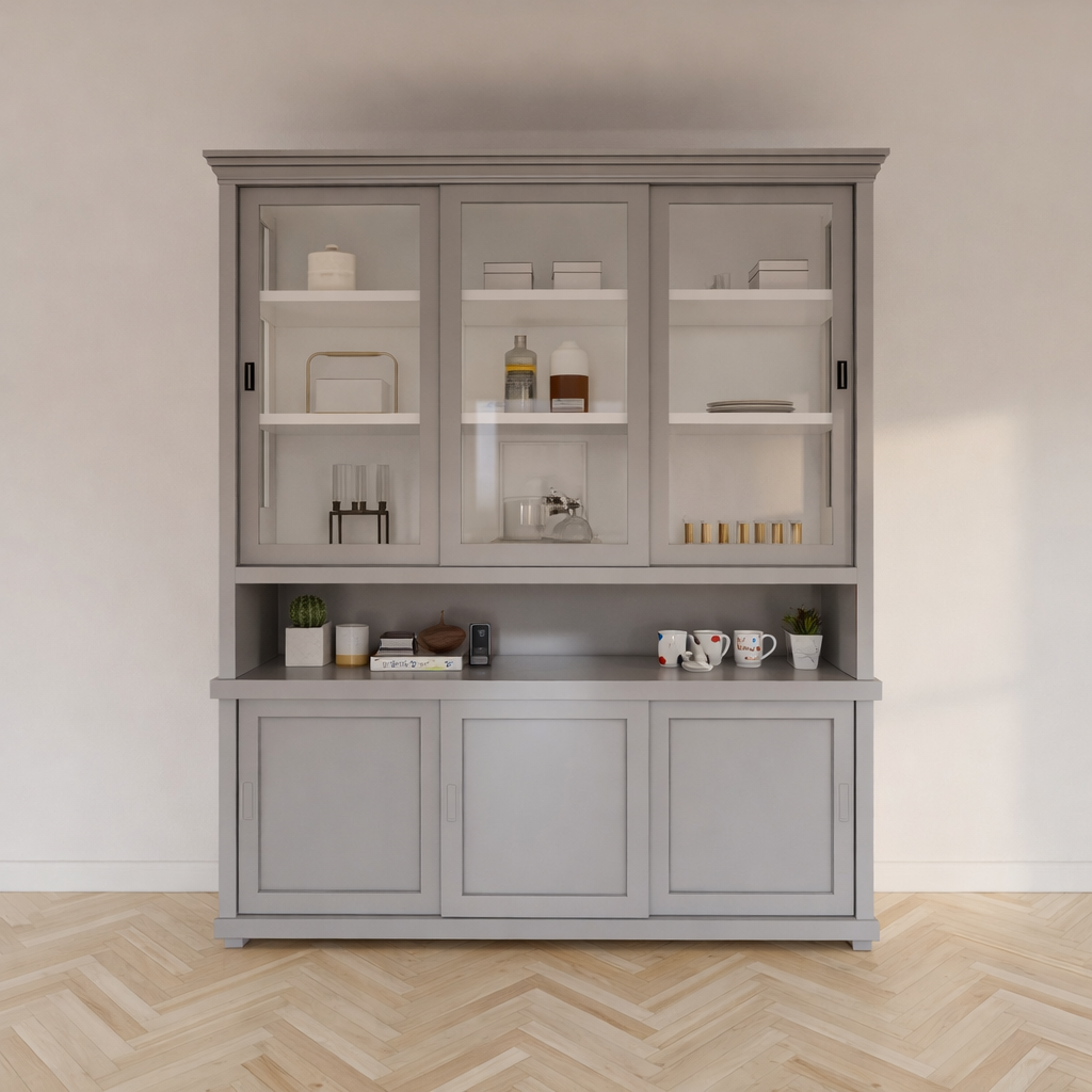 Let op: in tegenstelling tot veel van onze strakke anderen modellen, heeft de Buffetkast Tavira wel greepjes op de deuren zoals je ziet op de 3e afbeelding. Deze zorgen voor een klassieke uitstraling en maken het openen van de schuifdeuren extra gemakkelijk. De deels glazen deuren geven een subtiele inkijk in de kast, terwijl het open vak in het midden perfect is voor het tentoonstellen van je favoriete decoratieve items.