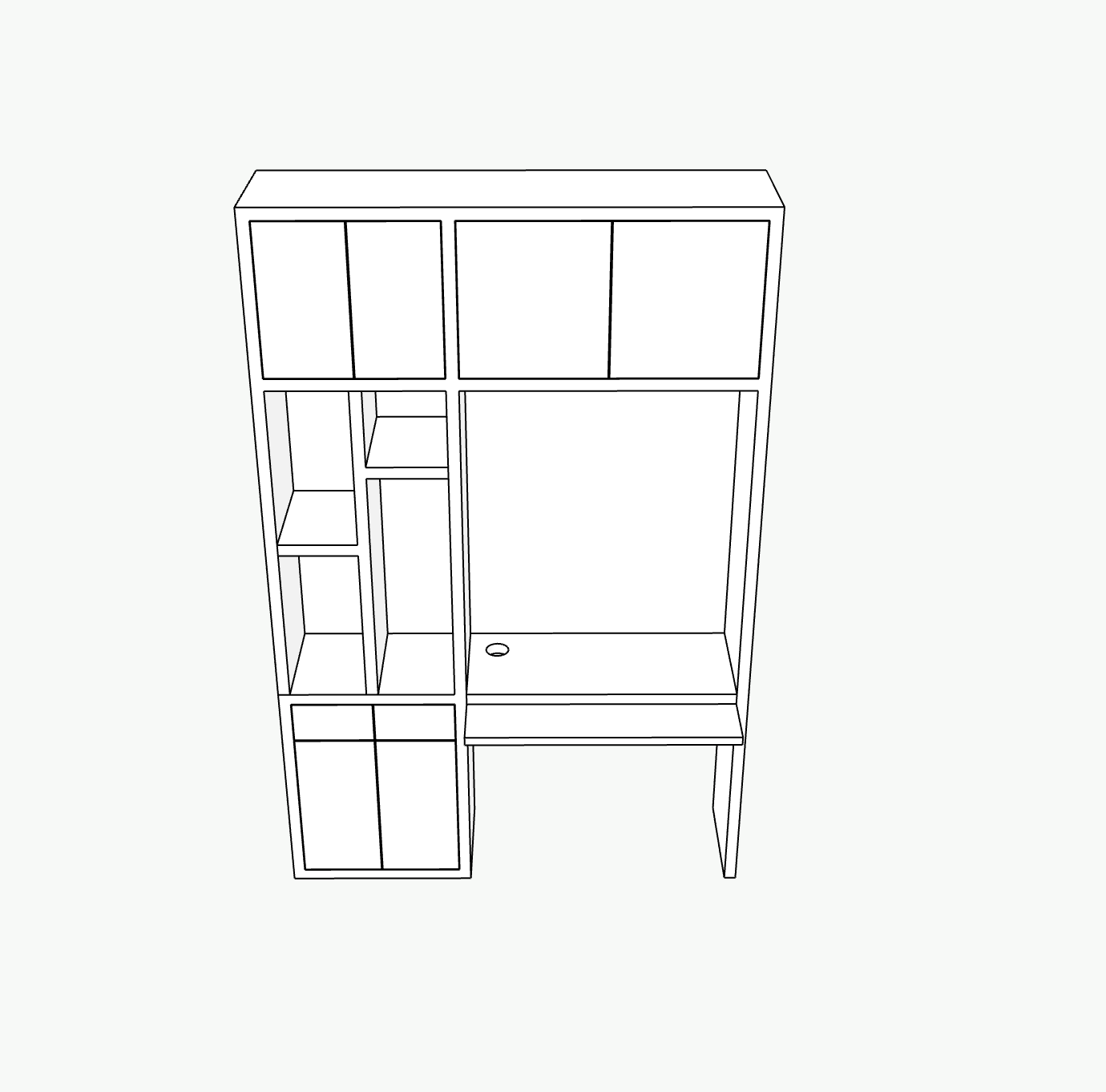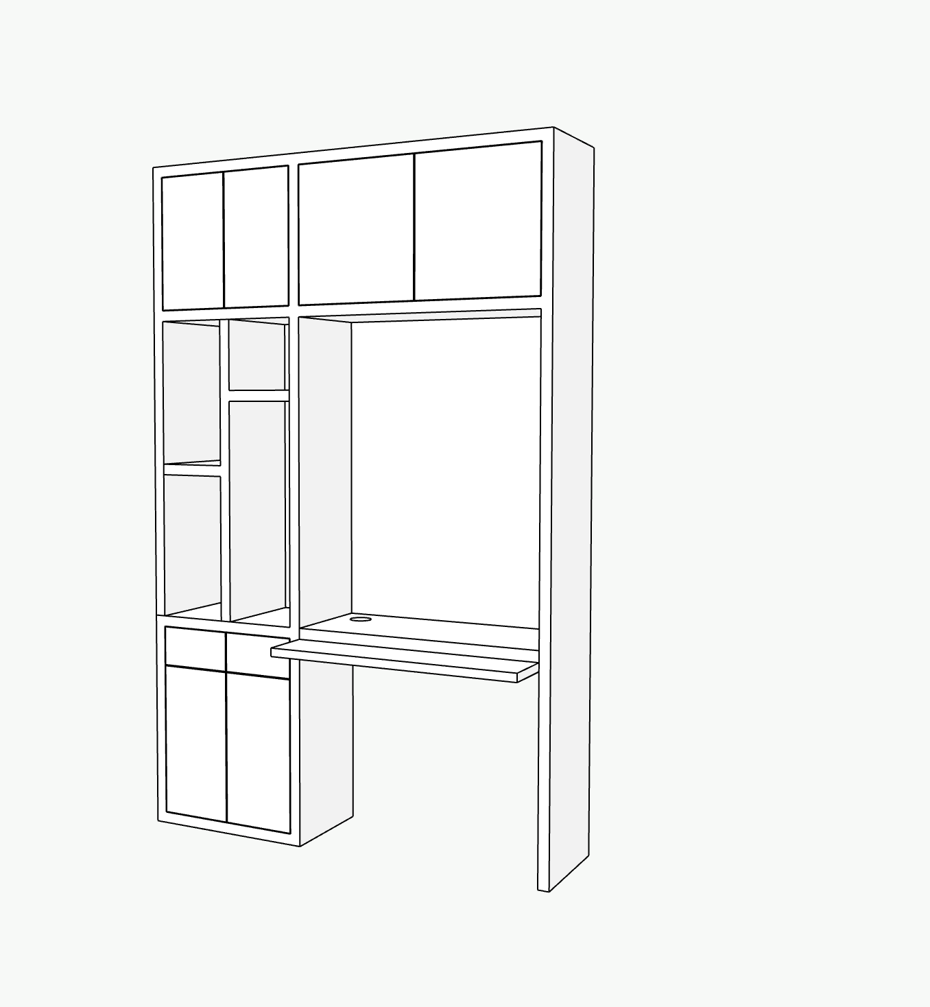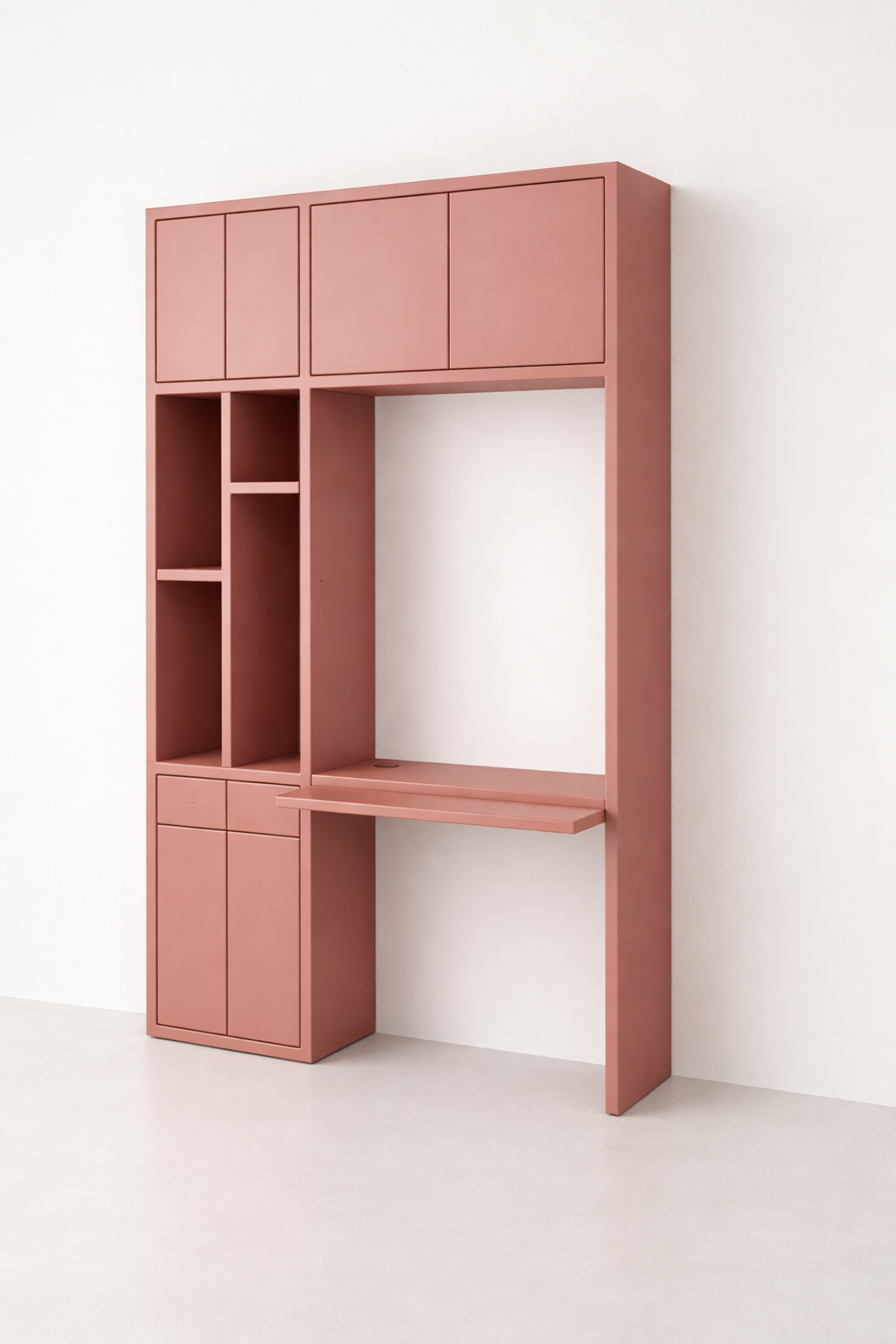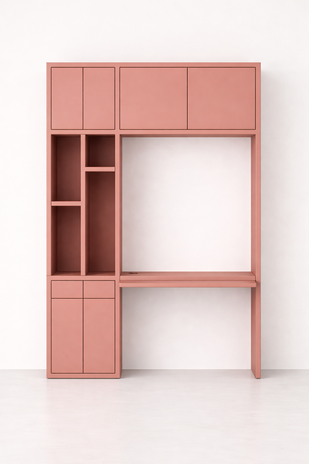 De kast is opgebouwd uit een royaal bureaublad met daarboven gesloten opbergruimte en aan de zijkant open vakken voor boeken, accessoires of decoratie. Onderin zorgen push-to-open deuren en lades voor extra opbergruimte, volledig uit het zicht.