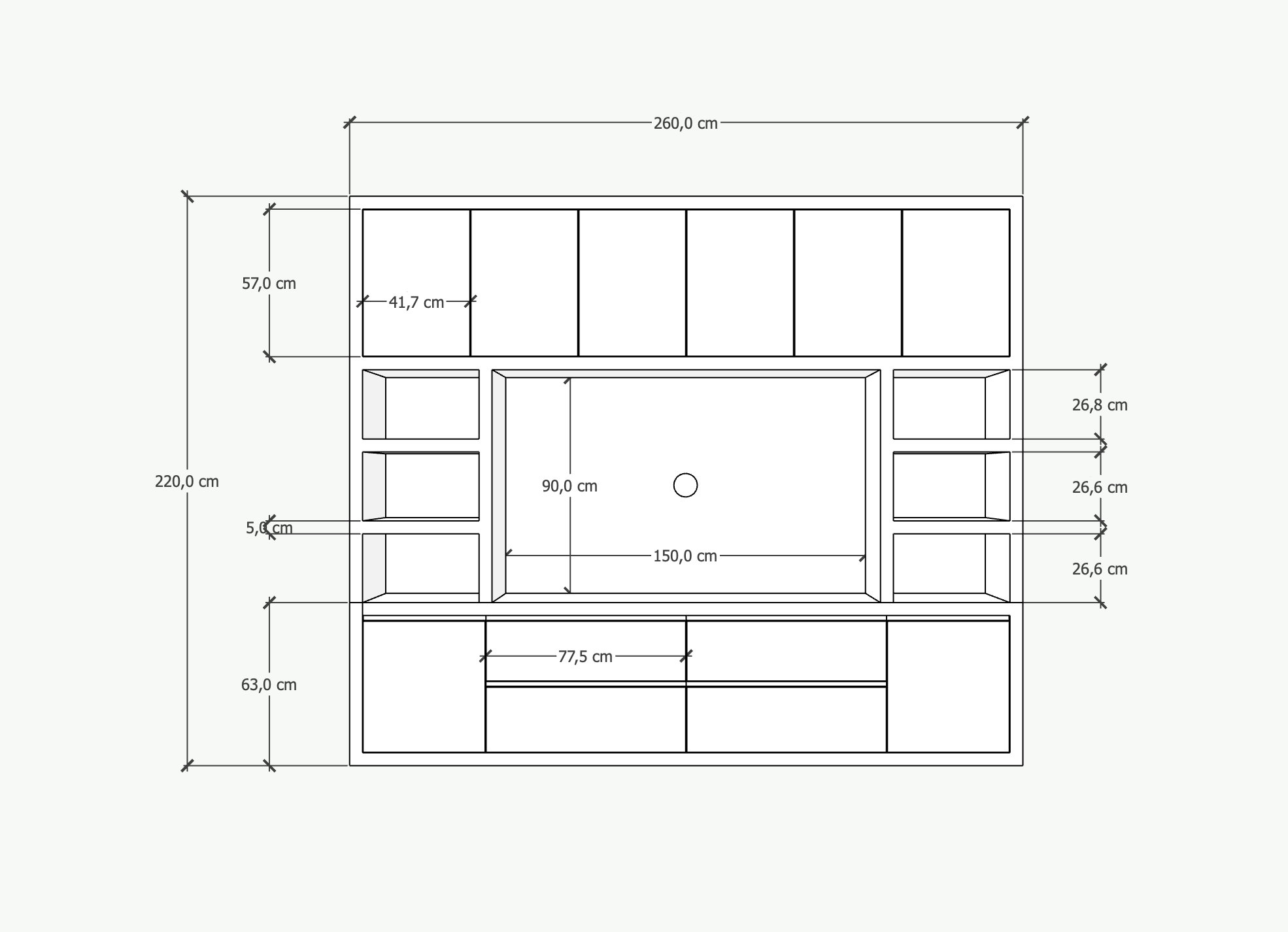 Cinewall Biarritz - 260x40x220H cm - tv vak - cinewall - push to open deuren - greeploze soft close lades - open vakken - strak design - 5cm plank en frame dikte