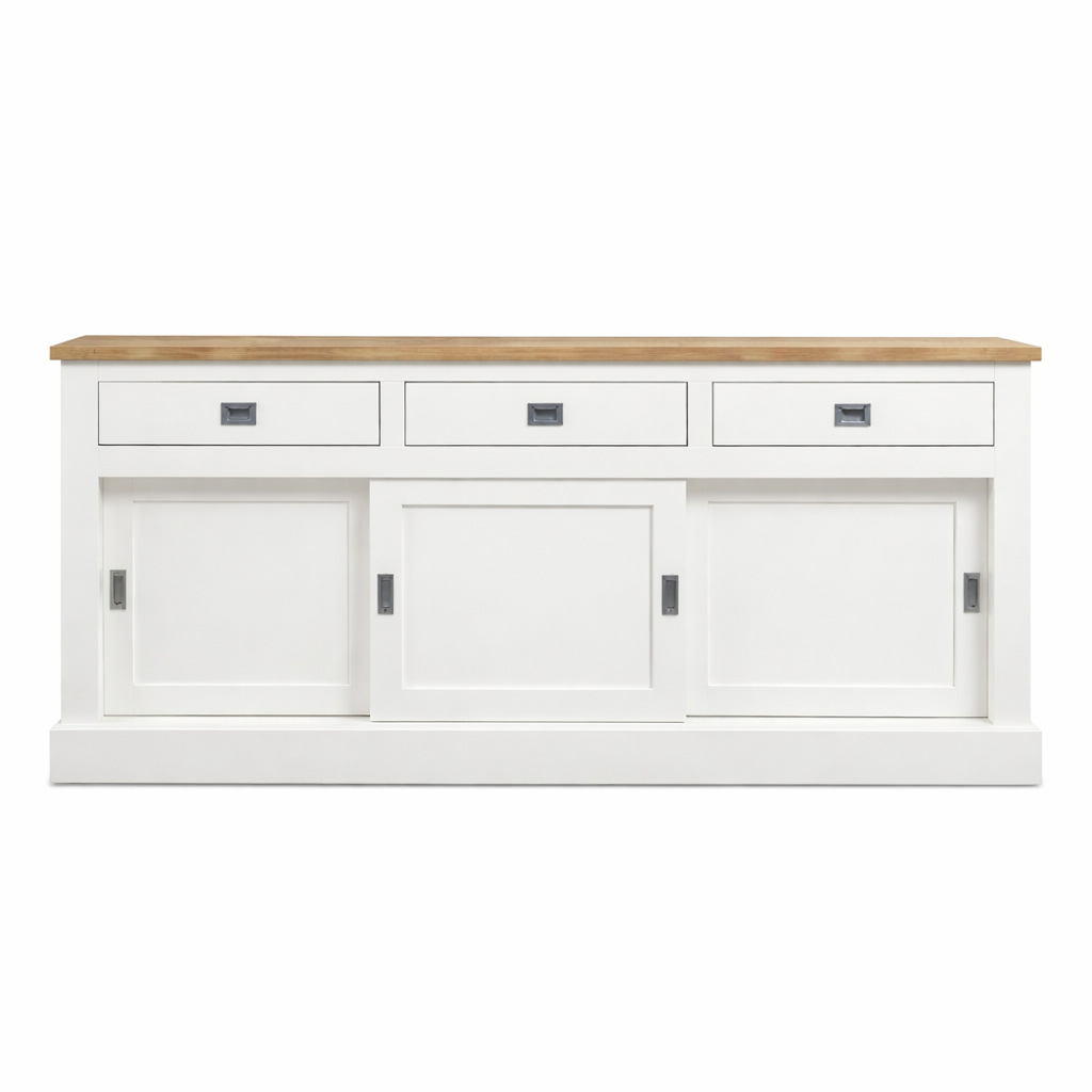 123kast  Dressoir Brooklyn 01 - 200x46x90H cm - met eiken bovenblad - 3 soft close lades - 3 dichte schuifdeuren