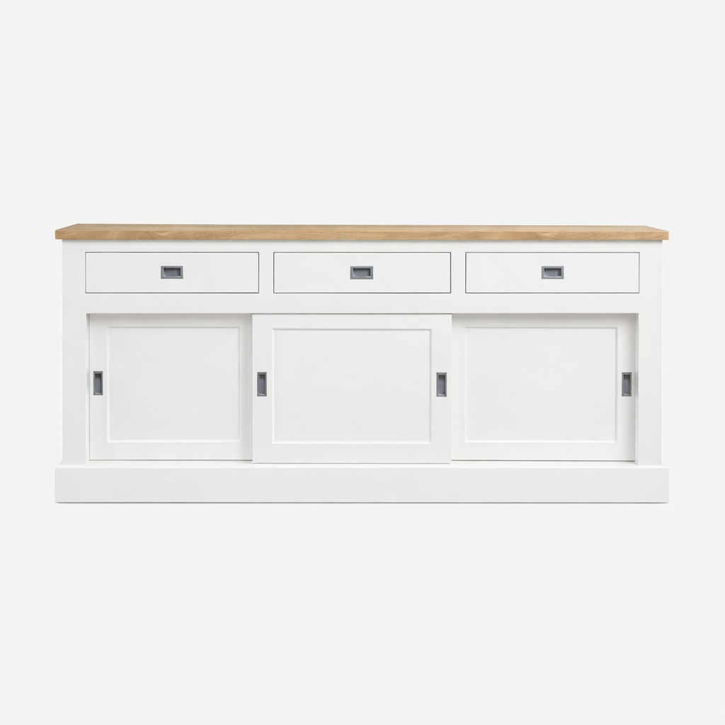 Dressoir Brooklyn 01 - 200x46x90H cm - met eiken bovenblad - 3 soft close lades - 3 dichte schuifdeuren