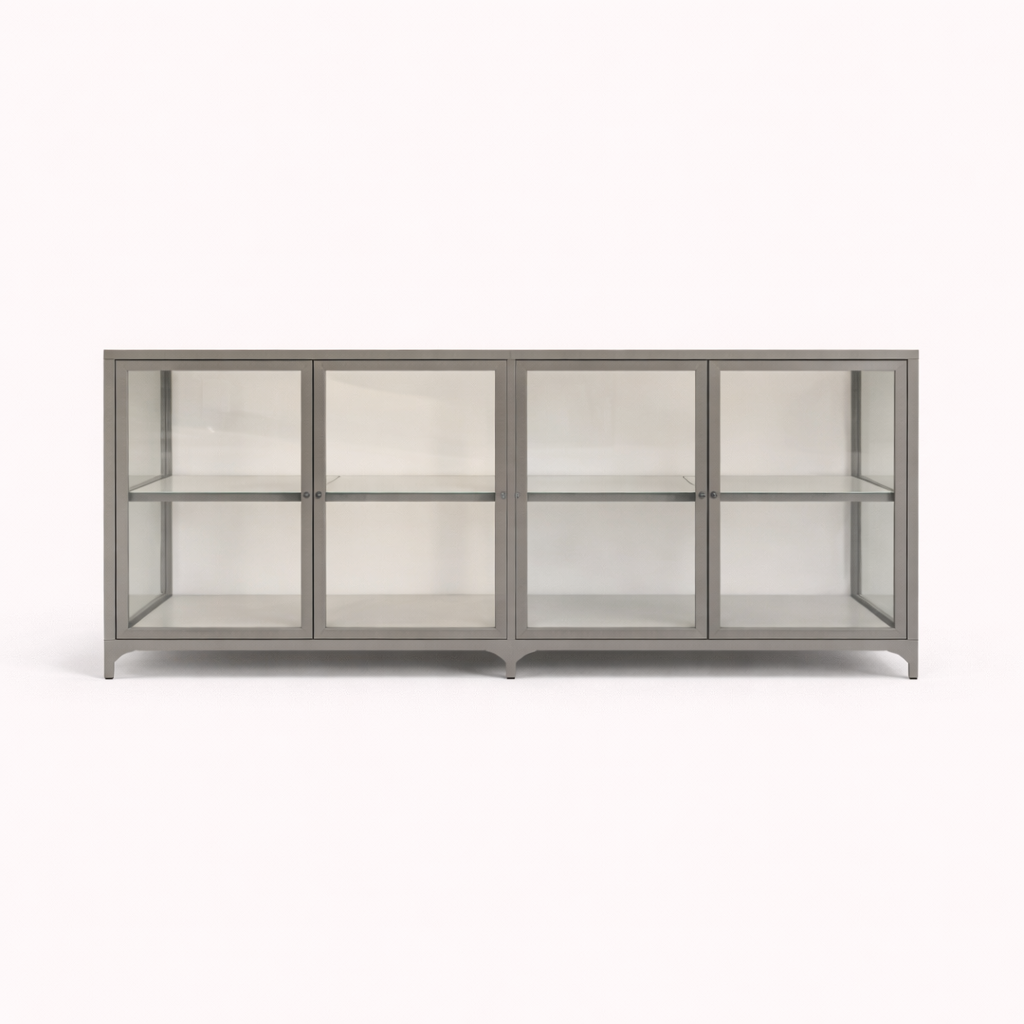 Met afmetingen van 200x45x80H cm biedt het dressoir/toonbank Belo voldoende ruimte voor opslag en presentatie, of het nu in een woonkamer, keuken of winkelomgeving wordt gebruikt. De vier scharnierdeuren zorgen voor gemakkelijke toegang tot de inhoud, terwijl het geheel van glas een lichte en luchtige uitstraling creëert.