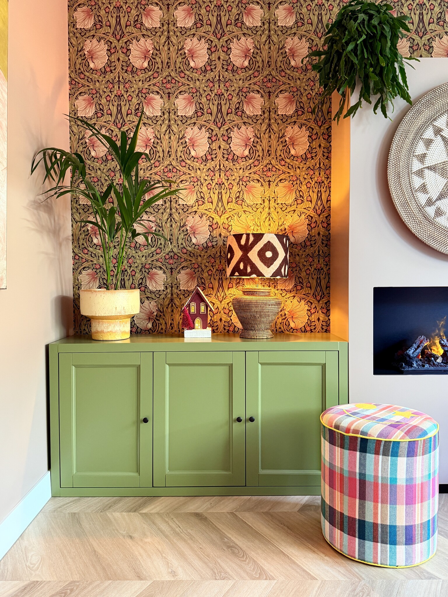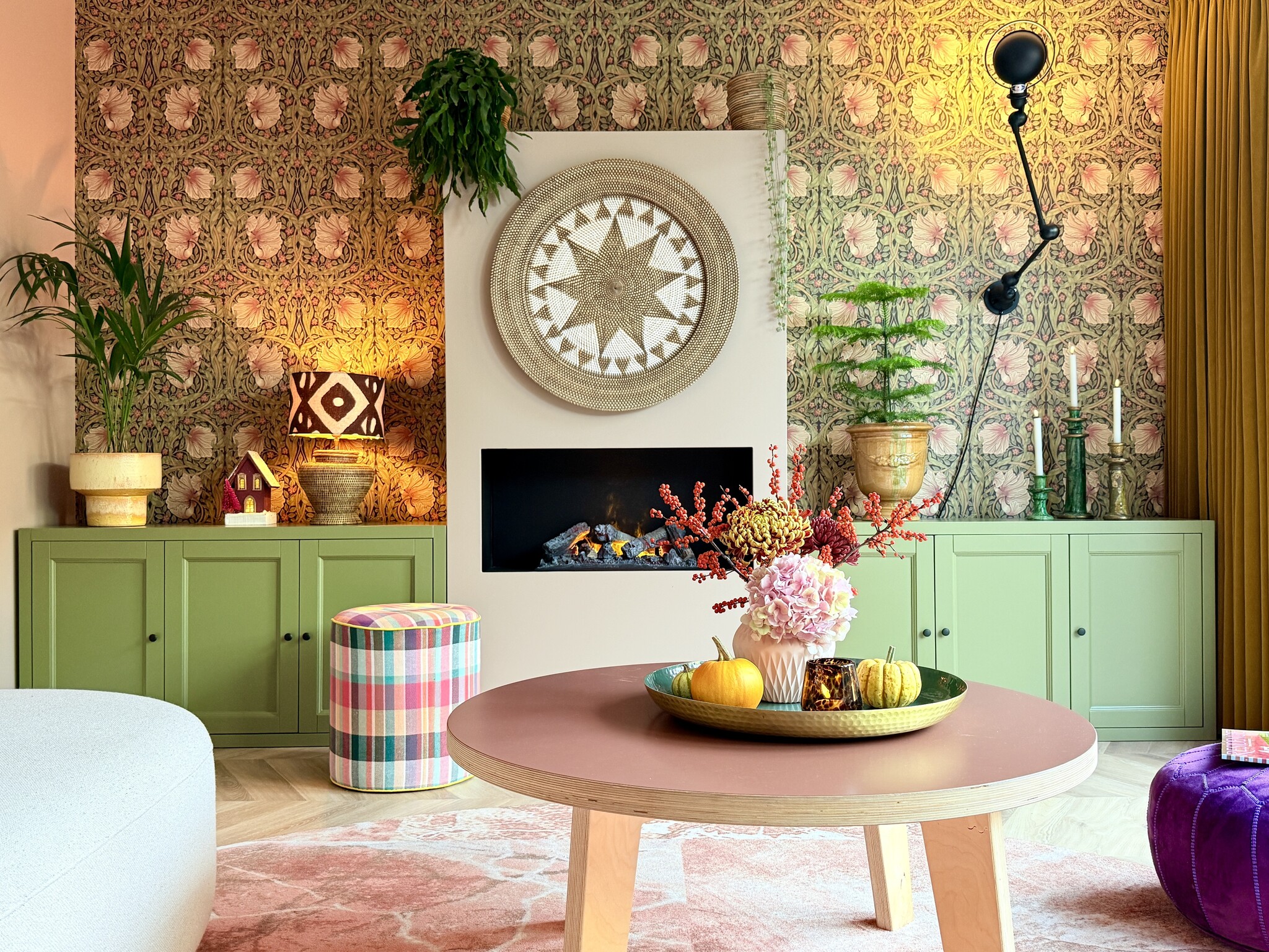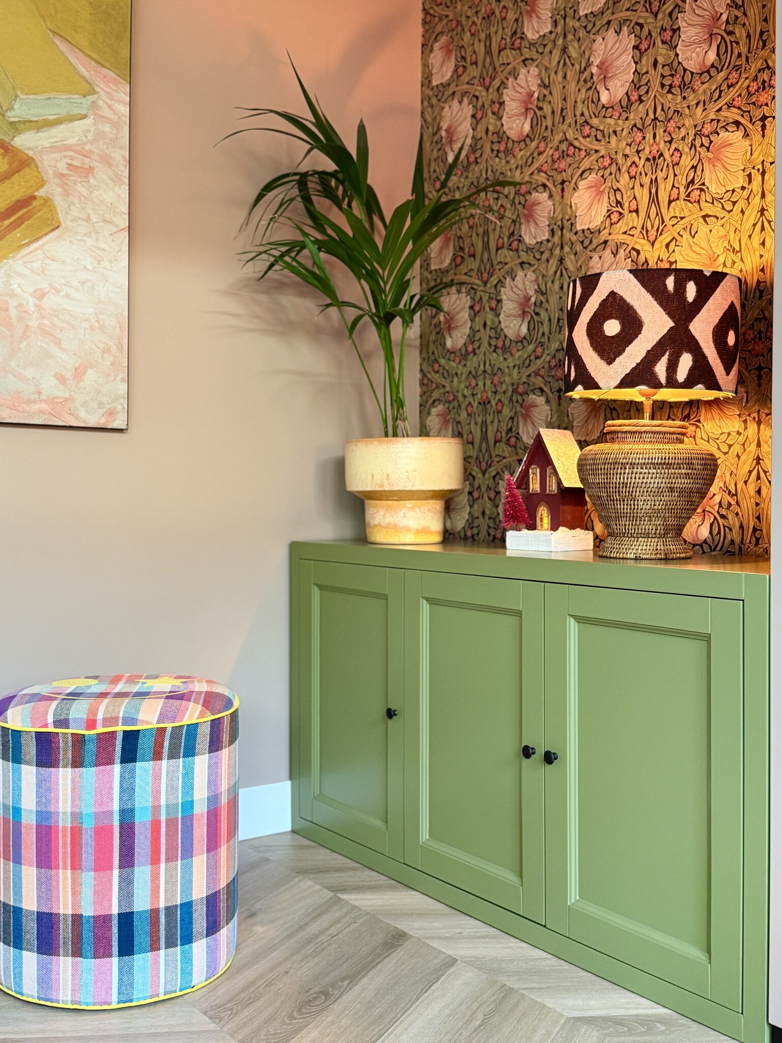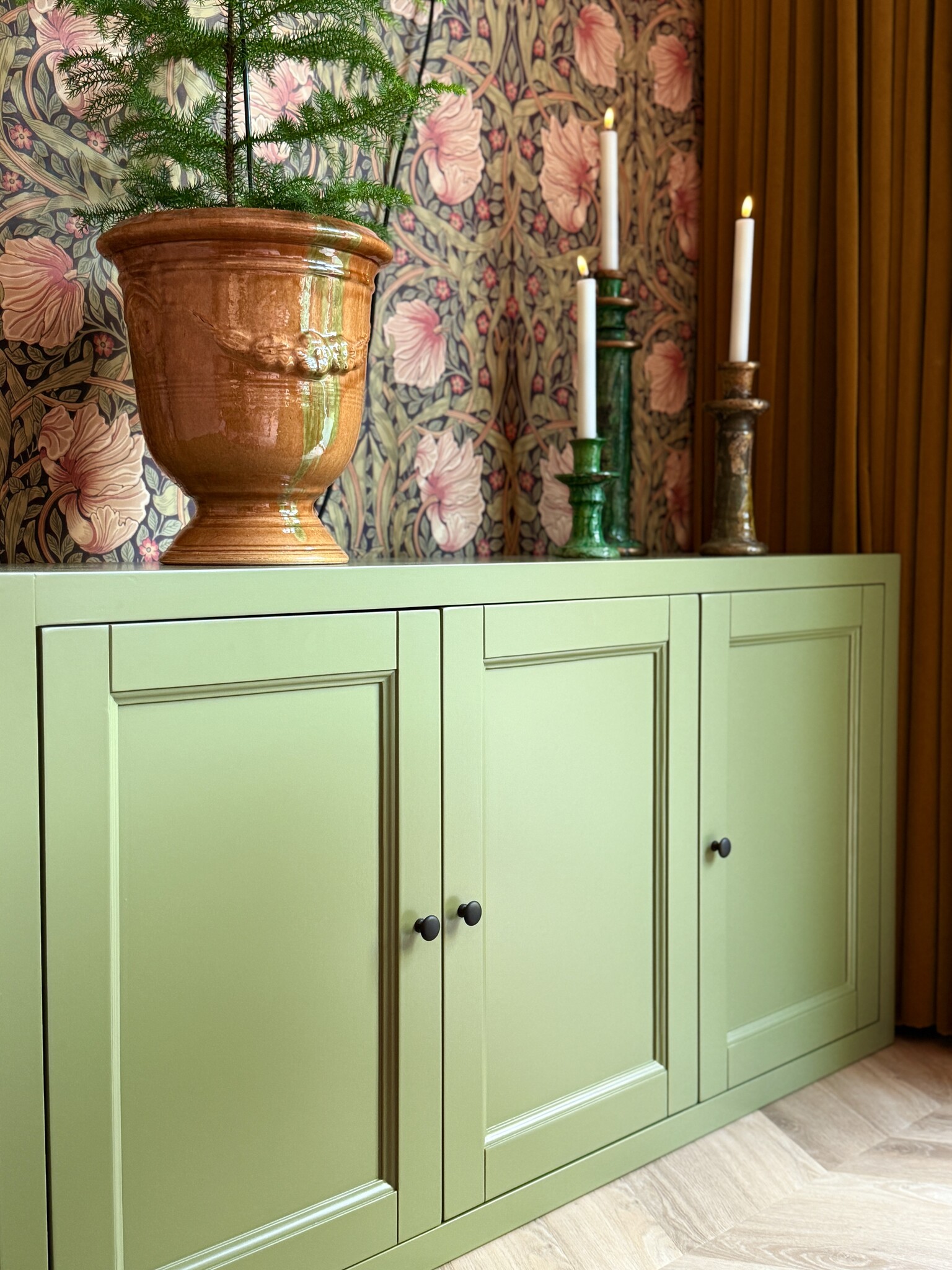 Het dressoir is voorzien van scharnierdeuren met subtiele sierlijsten, waardoor het meubel een klassieke, ambachtelijke uitstraling krijgt. Achter de deuren bevindt zich verrassend veel opbergruimte voor items die je graag netjes uit het zicht bewaart—van servies tot spelletjes of woonaccessoires. De verfijnde afwerking maakt het dressoir zowel geschikt voor een landelijk interieur als voor een kleurrijk boho of eclectisch woonstijlthema.
