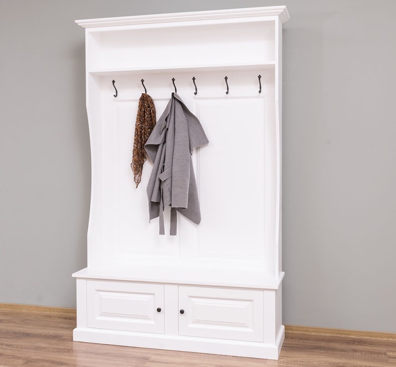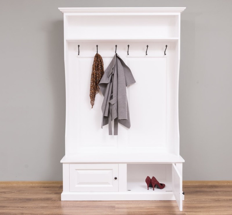 De garderobekast Mykonos is een slimme en stijlvolle oplossing voor jouw hal. Met afmetingen van 130x50x220H cm combineert deze kast een kapstok en een zitbankje in één functioneel meubelstuk.