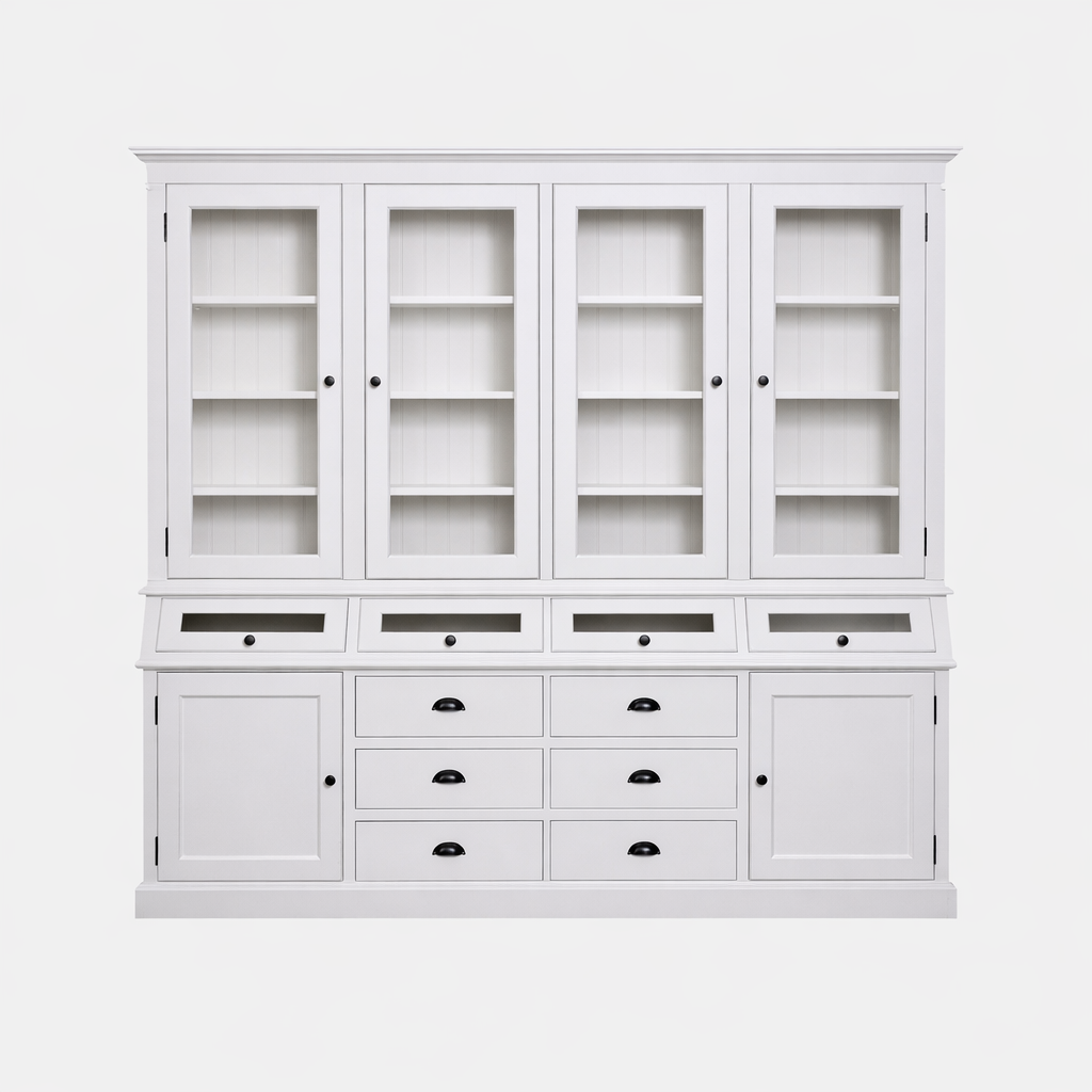 Grutterskast Cova - 214x50x226H cm - 4 vitrine scharnierdeuren - 4 kleppen - 6 lades - 2 dichte scharnierdeuren