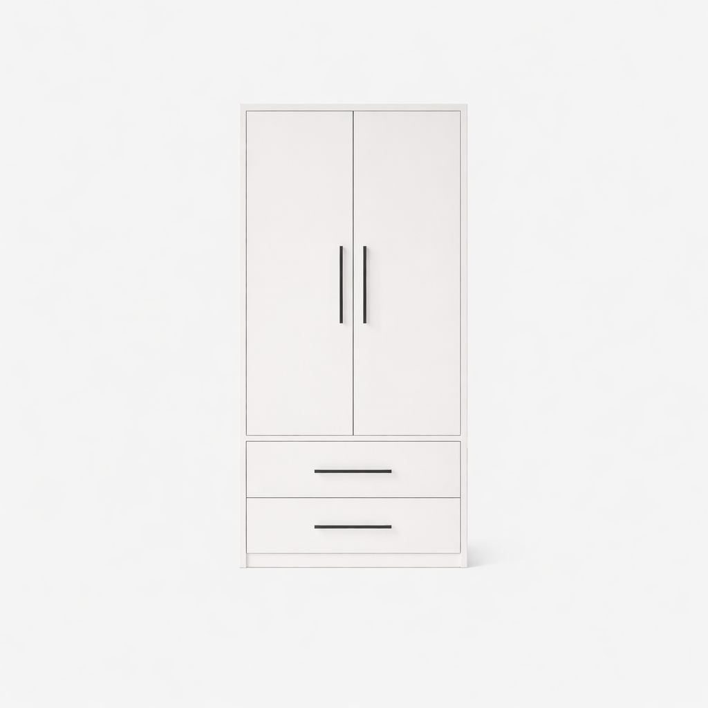 Met zijn afmetingen van 100x60x200H cm biedt deze kast voldoende ruimte voor al je kleding en accessoires. Het beschikt over 2 deuren en 2 lades, perfect georganiseerd voor een opgeruimde look.