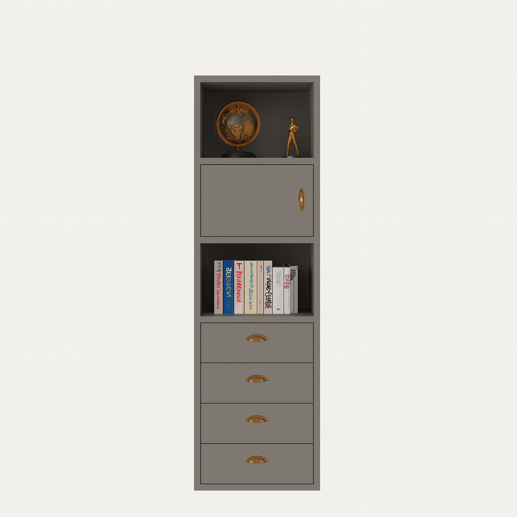 De kast is voorzien van vier ruime soft close lades die soepel en geruisloos sluiten, ideaal voor het opbergen van papieren, accessoires of andere dagelijkse benodigdheden. Boven de lades bevindt zich een open vak voor boeken of decoratie, en een deurtje met scharnier dat extra afgesloten ruimte biedt. Het bovenste open vak is perfect voor het presenteren van een persoonlijk object of kunststuk.