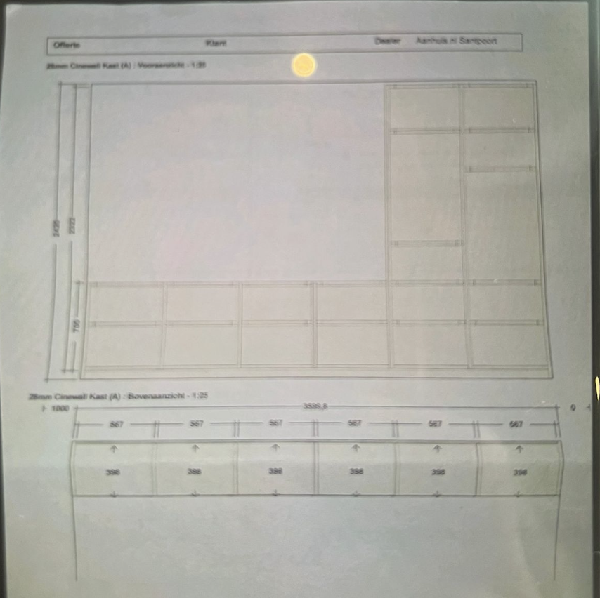 Maatwerk dressoir kast (zoals schets) - 380 x 30/40 x 240H cm - 3 cm plankdikte - eigen indeling vakken - 2 deurtjes boven in - push to open - 6 deurtjes onderin het dressoir - S 2005 Y10R