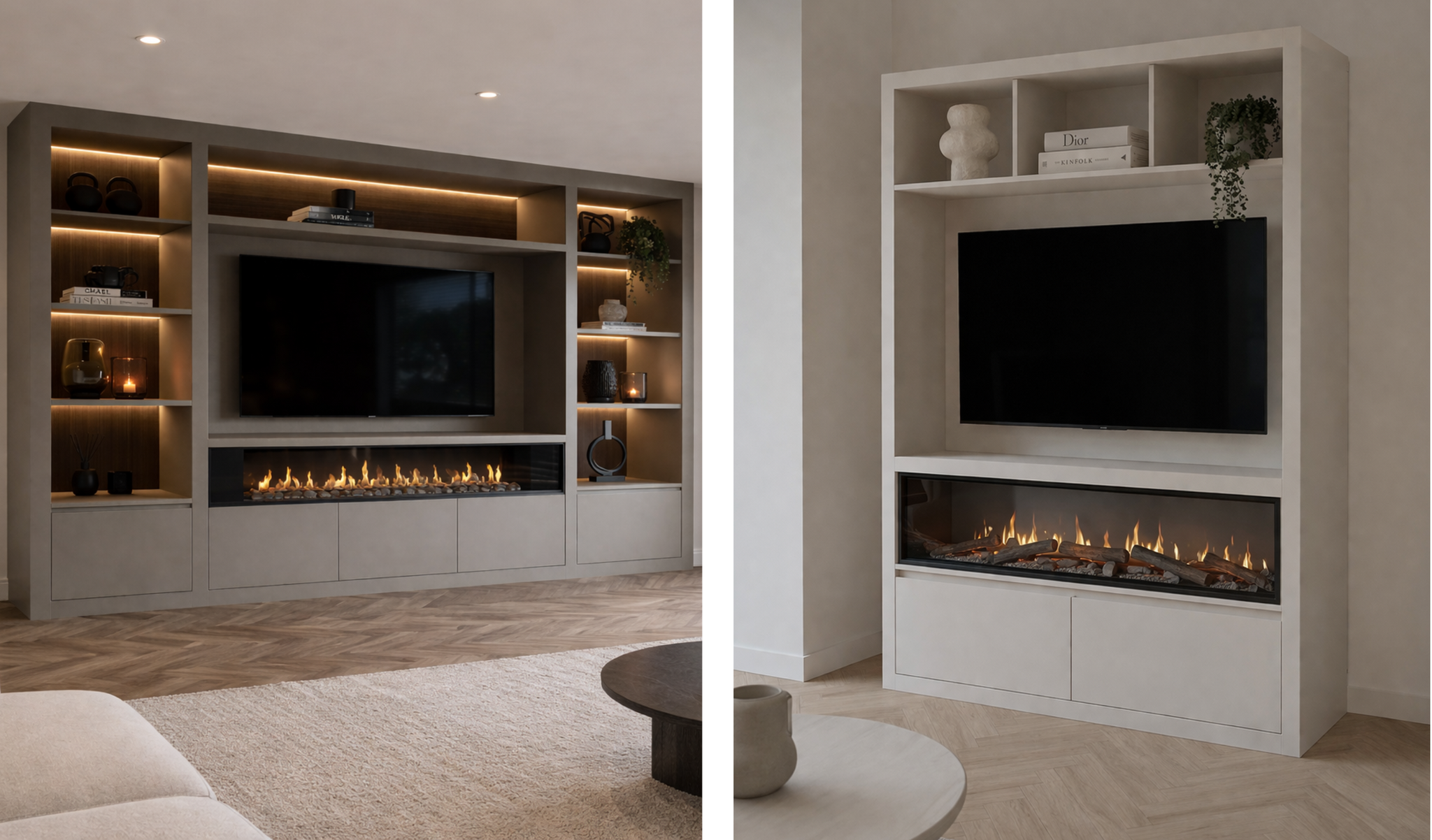 Een cinewall met haard brengt warmte en sfeer in je woonkamer. Wij werken samen met een vaste haardenleverancier en bouwen de sfeerhaard direct in het ontwerp in. Je kunt de haard ook zelf aanleveren; we stemmen de maten en technische eisen dan precies op jouw model af.