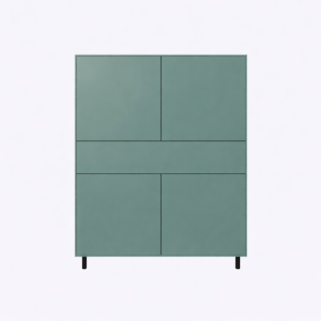 De opbergkast Piana is een stijlvolle en veelzijdige kast met de afmetingen 112x42x162H cm. Deze kast staat stevig op slanke, zwarte stalen poten en heeft zowel praktische als esthetische eigenschappen. Uitgerust met één push-to-open lade en vier push-to-open deuren, biedt de Piana voldoende opbergruimte voor verschillende spullen, terwijl het strakke, greeploze ontwerp zorgt voor een moderne uitstraling.