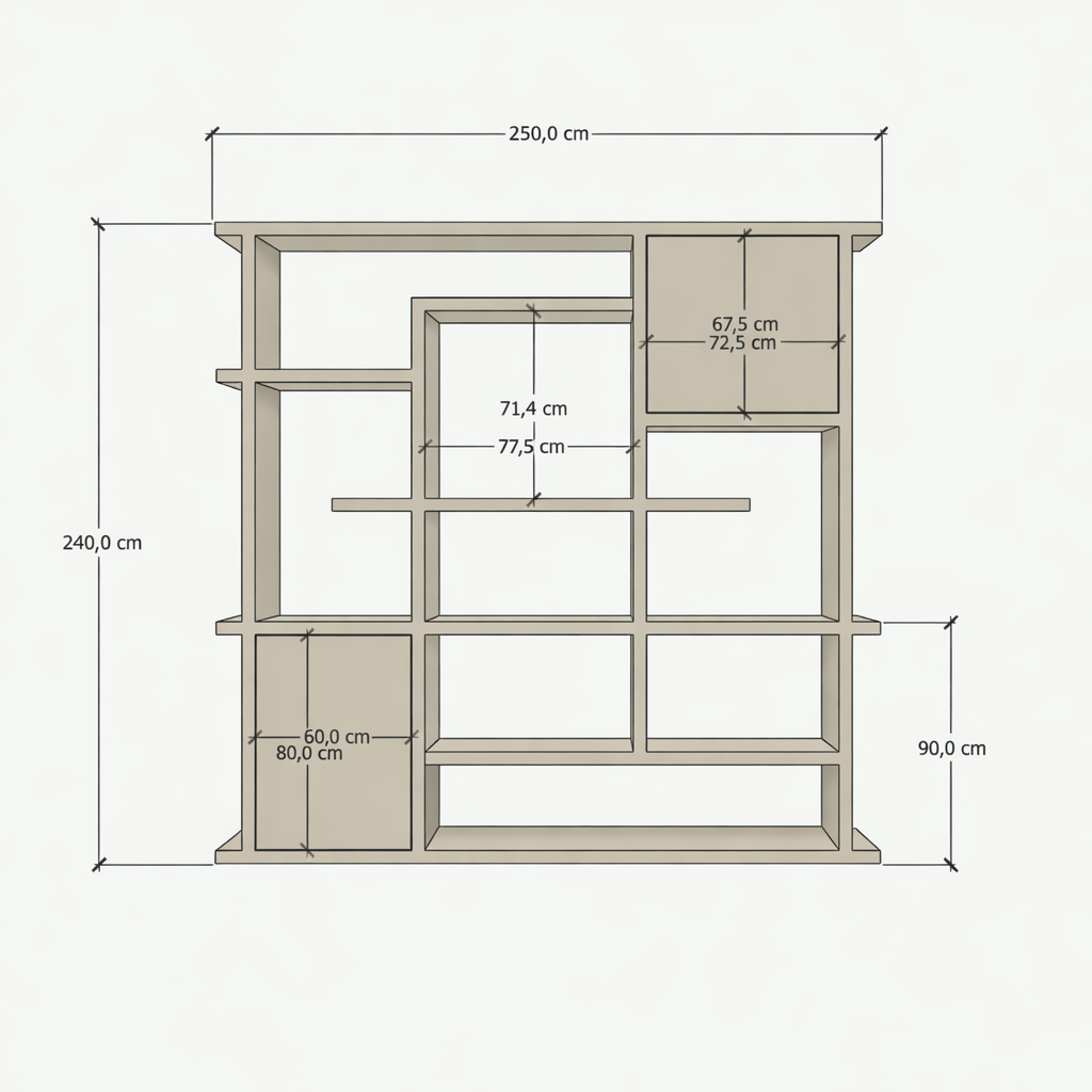 Met zijn royale formaat van 250 × 40 × 240 cm (h) biedt de Evora meer dan genoeg ruimte voor boeken, decoratie, kunstwerken of persoonlijke items. De combinatie van open vakken en gesloten opbergruimte maakt deze kast ideaal voor wie zowel sfeer als functionaliteit zoekt.