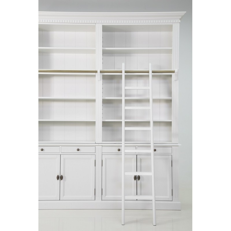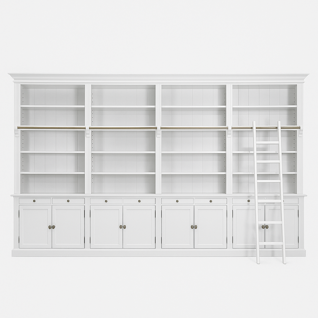 Boekenkast Private Library - 400x43x240H cm - demontabel - met stang en ladder - verstelbare planken - 20 planken - 8 lades - 8 dichte scharnierdeuren