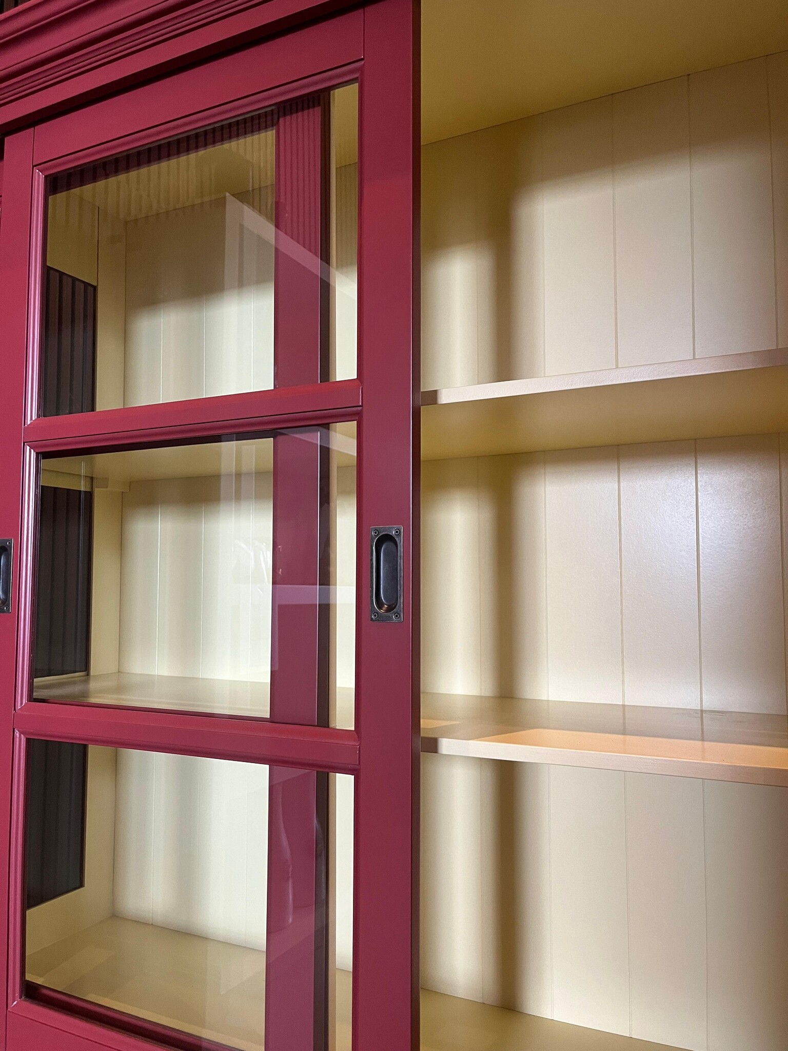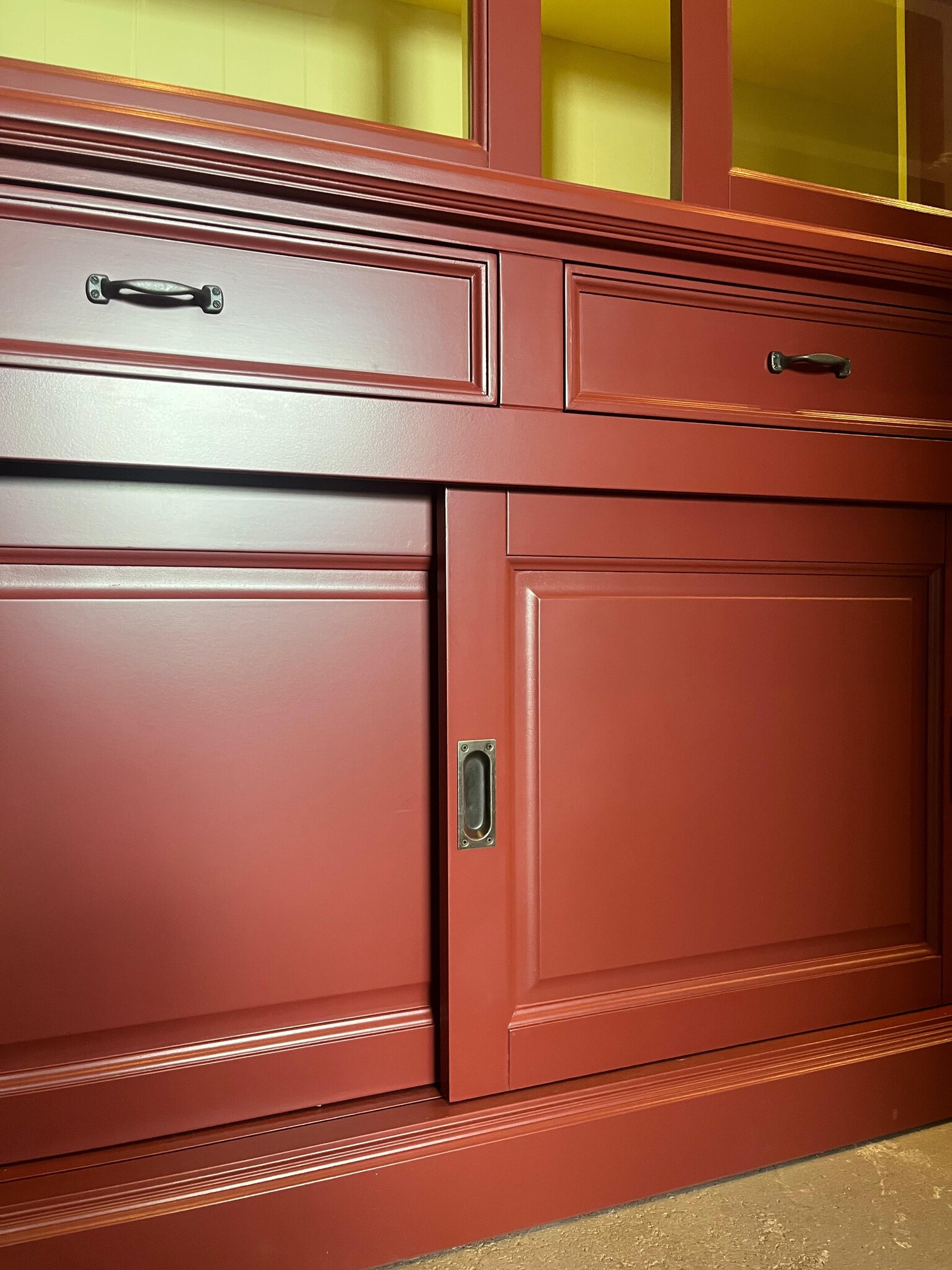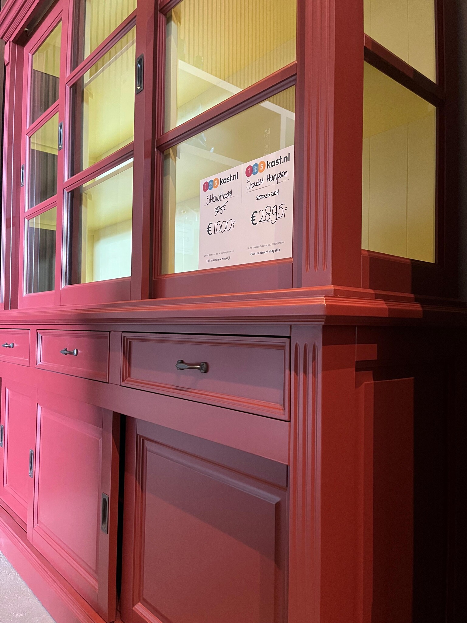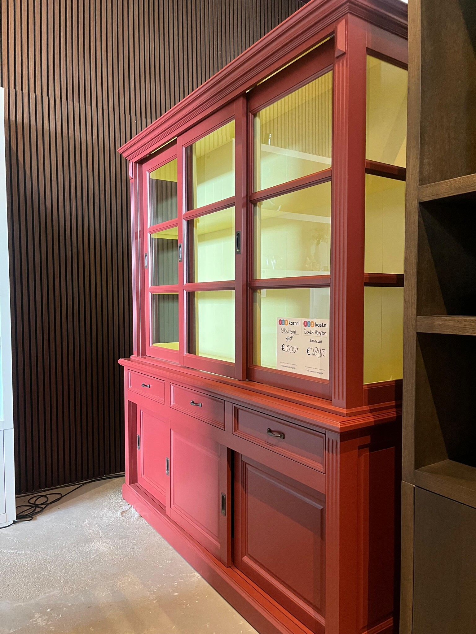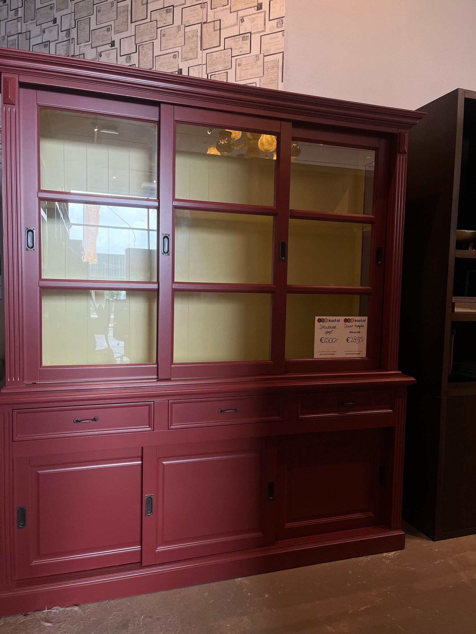 Dit betreft een showmodel, maar de kast verkeert in nieuwstaat. Hij heeft uitsluitend in onze showroom gestaan en is daarmee direct beschikbaar voor een nieuw thuis. Uitgevoerd in de warme, diepe rode tint, straalt de kast luxe en karakter uit – perfect passend in zowel klassieke als landelijke interieurs.
