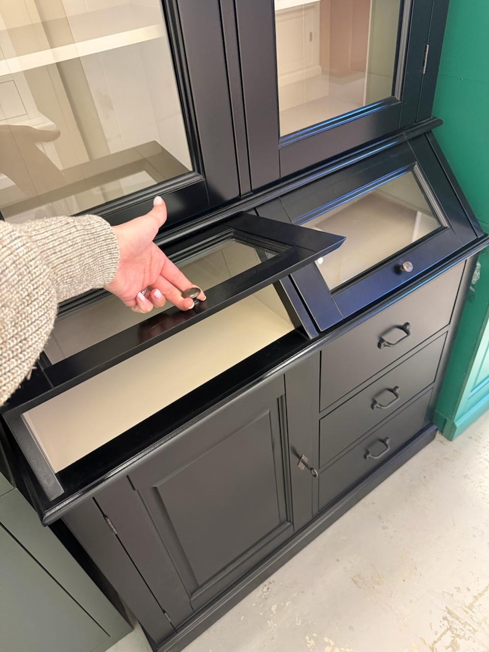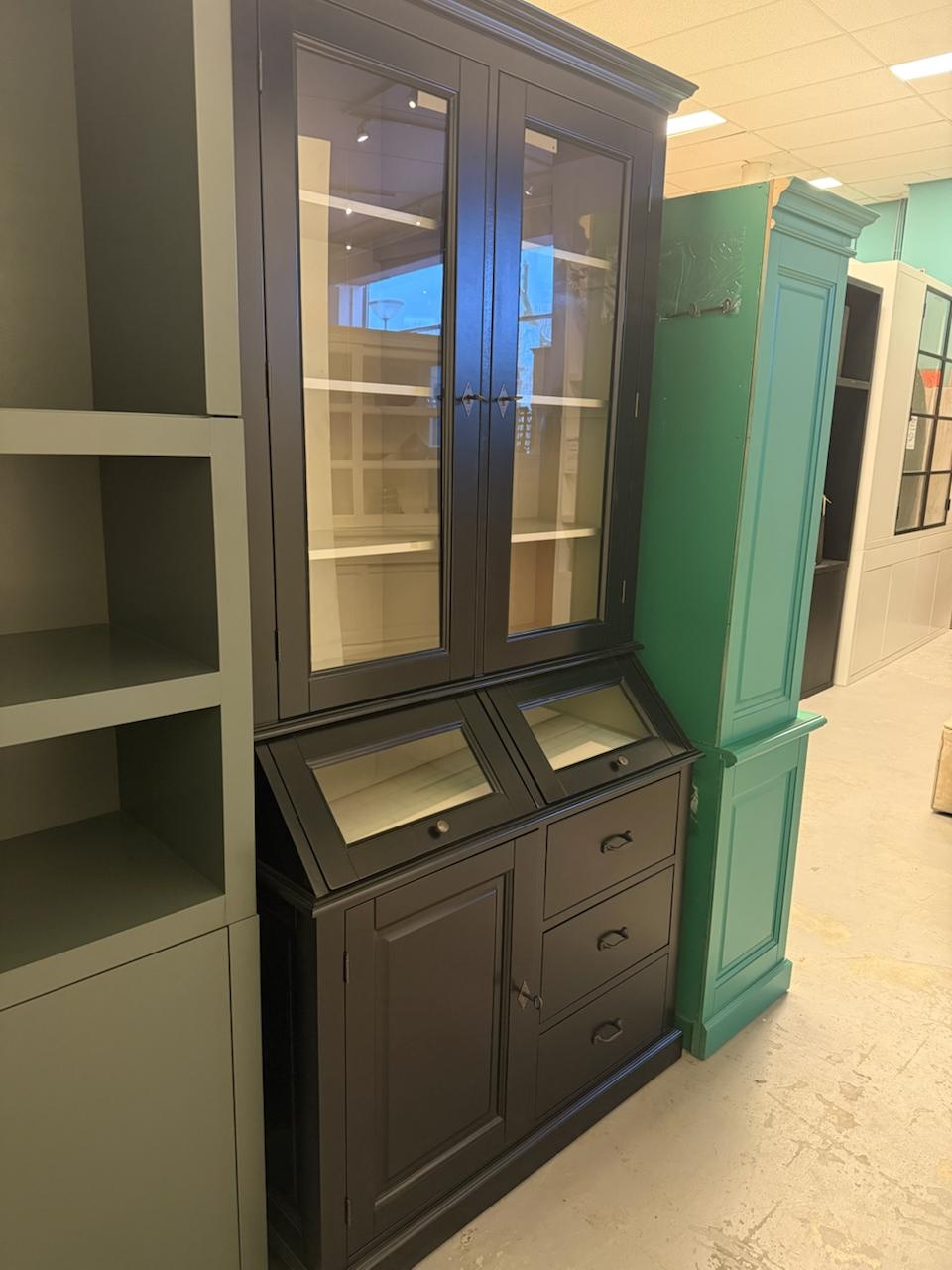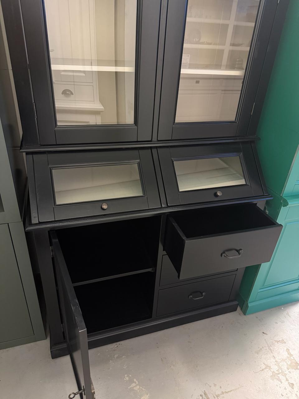 Showmodel Grutterskast Porto Marie - 110x52x220H cm - RAL 9011 buiten - Leem binnen - 3 scharnierdeuren - 2 kleppen - 3 soft close lades