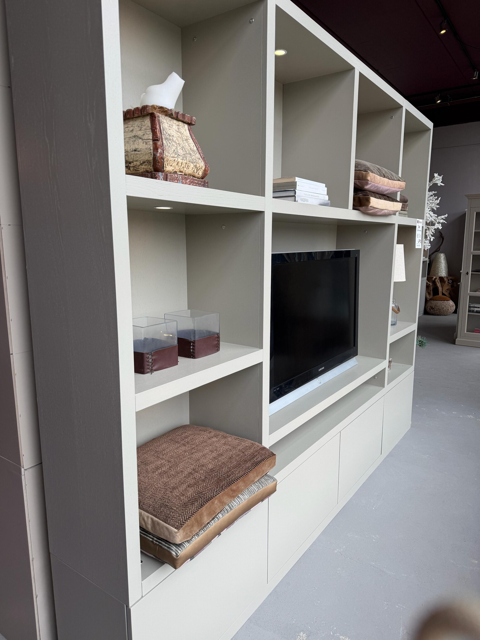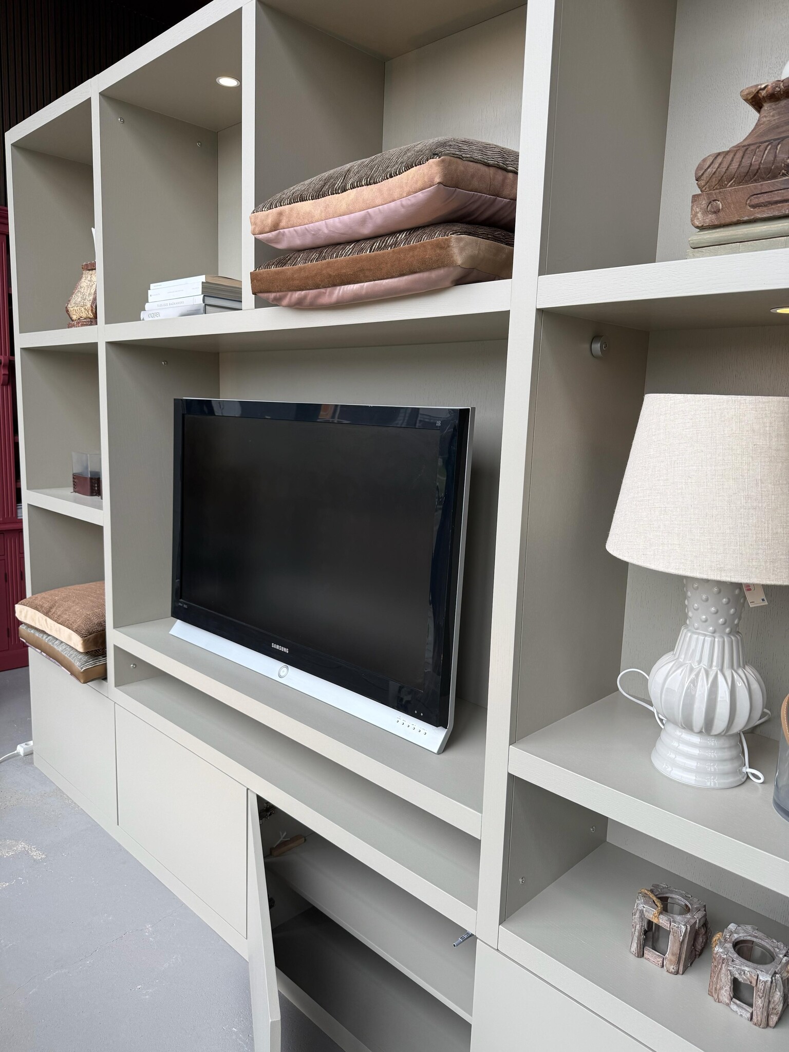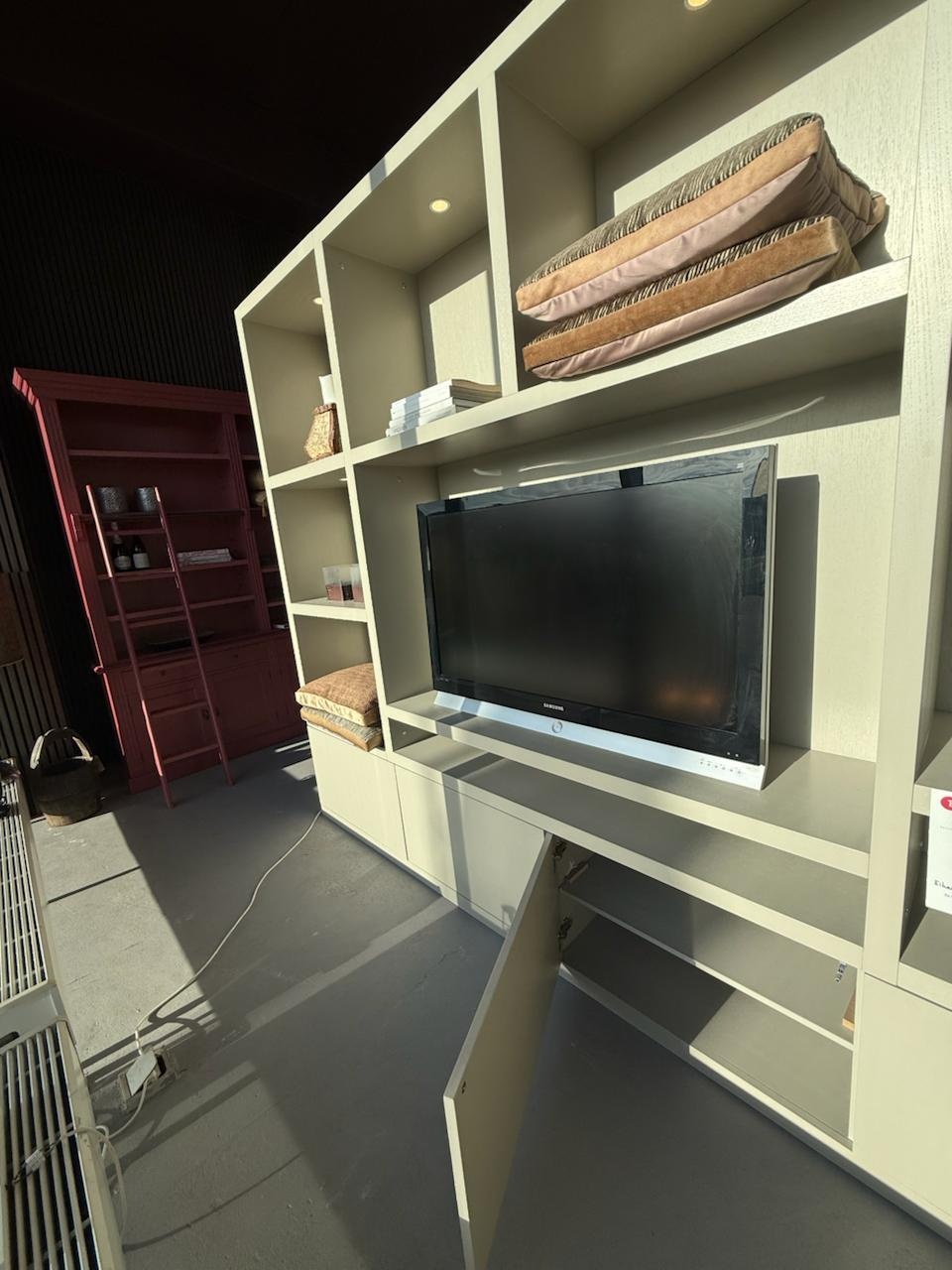 Dankzij de vier push-to-open deurtjes oogt de kast rustig en greeploos. Open vakken zijn ideaal voor decoratie, boeken of apparatuur, terwijl gesloten delen spullen netjes uit het zicht houden. De kast is geschikt voor een grote tv en accessoires.