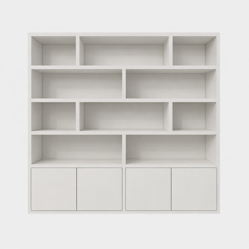 Showmodel Vakkenkast Londen 02 - 250x40x240H cm - strak design - 4 greeploze deuren - push to open deuren - open vakken - 5cm plank dikte