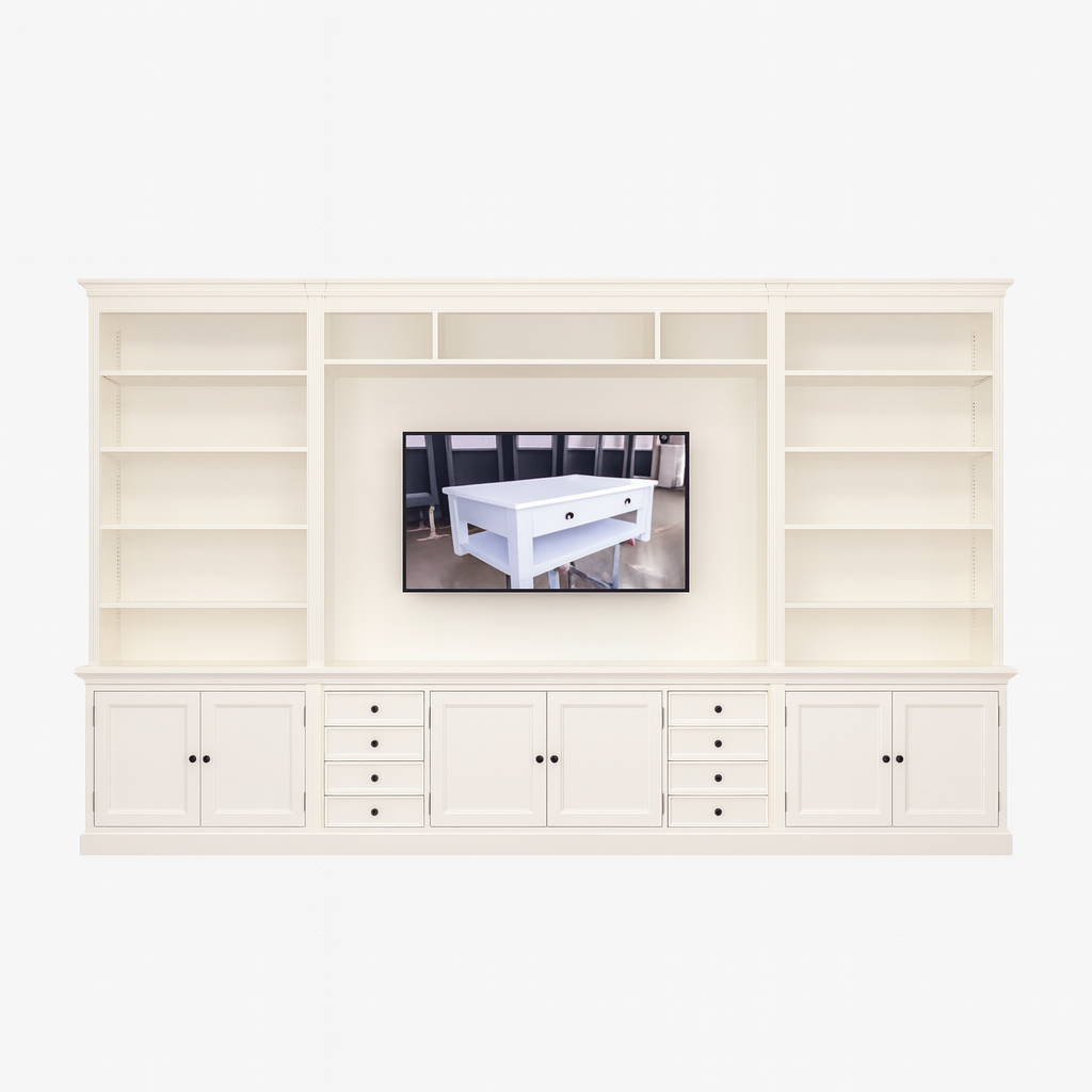 Opzoek naar een echte eyecatcher in huis waar je óók nog eens je tv in kwijt kan? Dan is kast Malta dé ideale oplossing.  Deze prachtige hoogwaardige boekenkast van maar liefst 4 meter breed heeft in het midden een groot tv vak van 200b x 140H cm, daarnaast biedt de kast door de lades en deuren veel opbergruimte. Uiteraard kan er op gewenste plek een gat gemaakt worden voor de bekabeling. Tv boekenkast Malta is leverbaar in alle RAL kleuren.