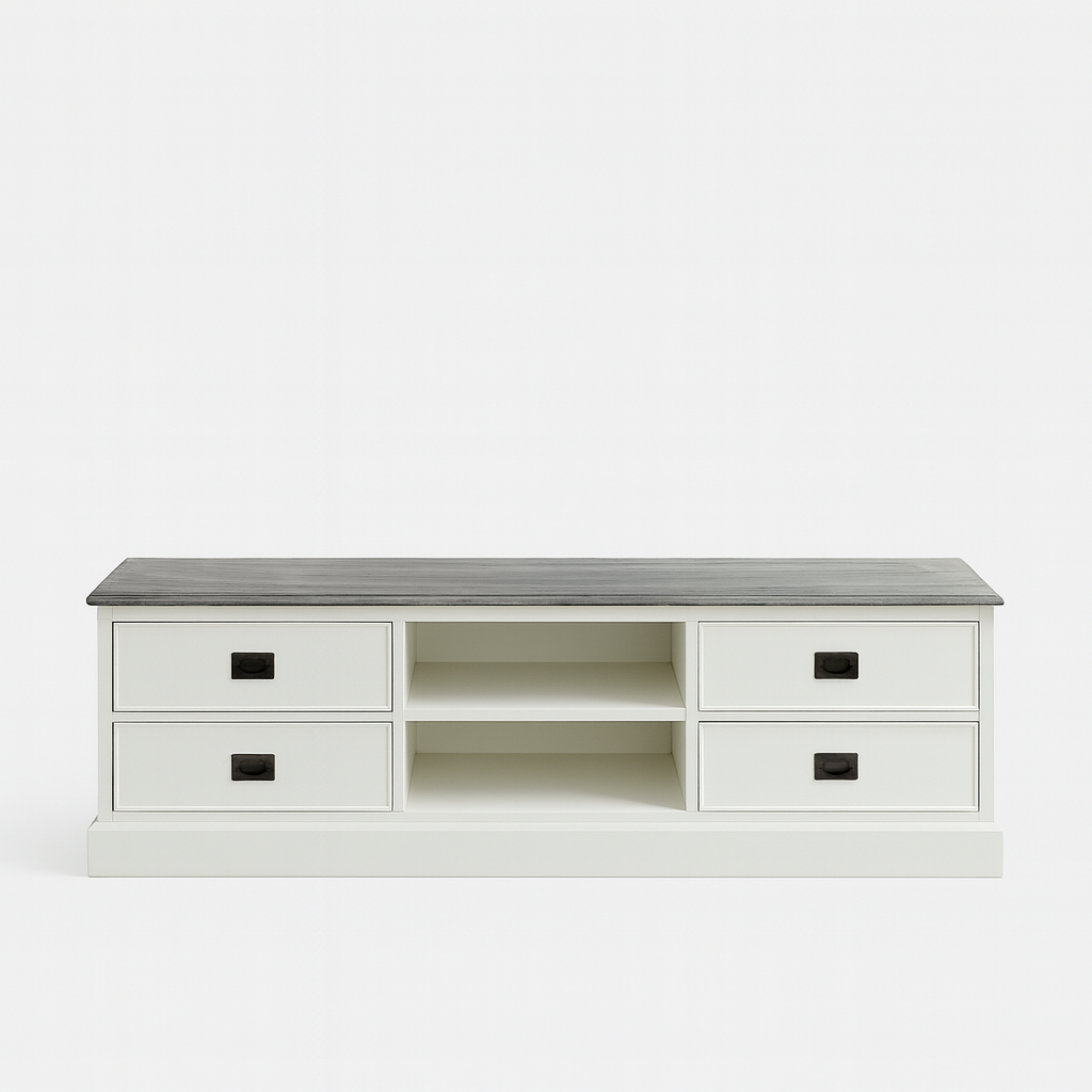 Tv dressoir Lin 04 - 160x50x50H cm - 4 lades - open middenvak - met kabelgat - optioneel vergrijsd bovenblad