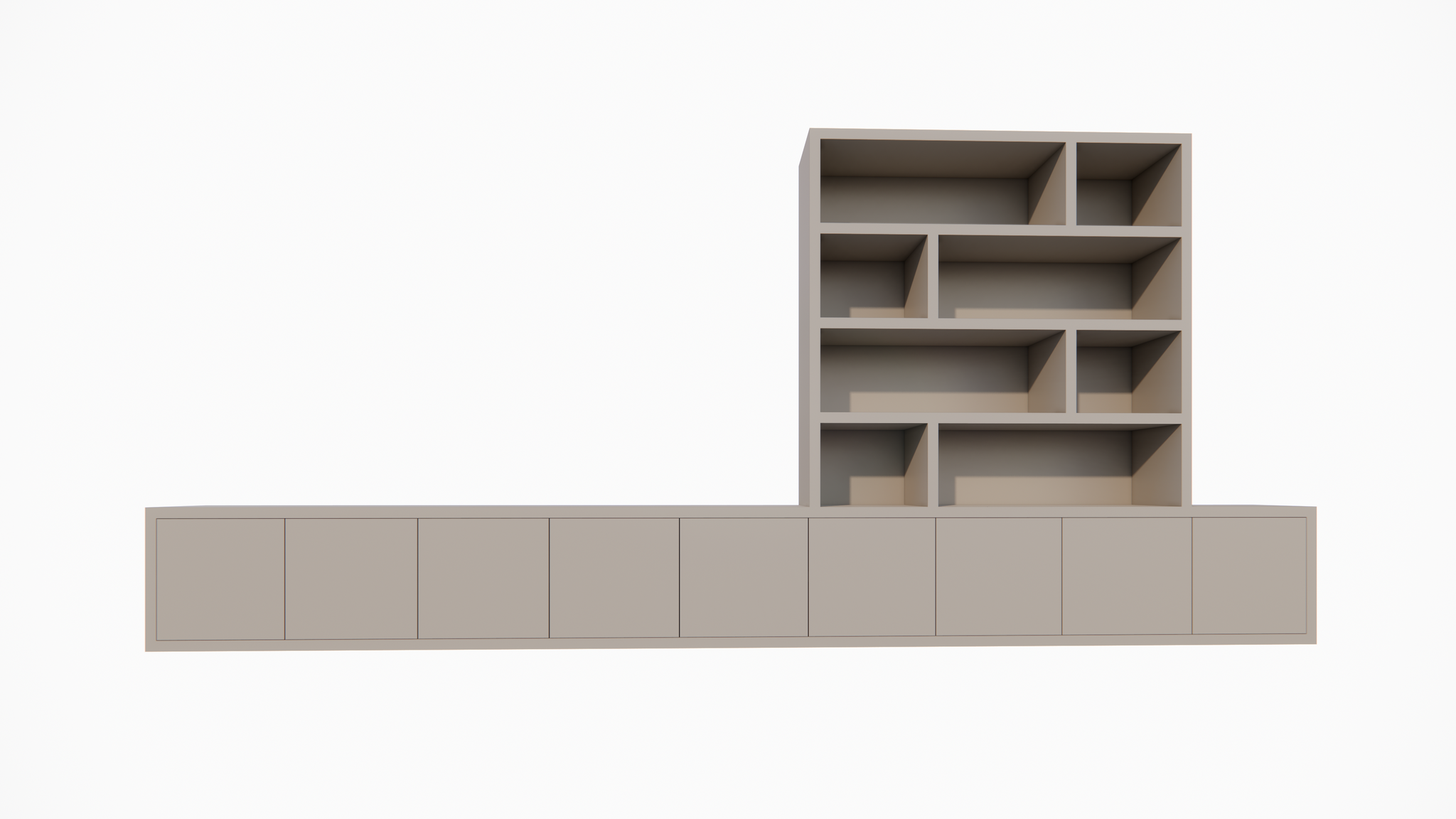 De onderkast bestaat uit een lang, laag dressoir voorzien van push-to-open deuren. Deze greeploze afwerking geeft de kast een rustige en moderne uitstraling. Achter de deuren is voldoende ruimte om apparatuur, kabels en andere spullen netjes op te bergen. Bovenop het dressoir bevindt zich een asymmetrisch ontworpen open vakkenkast, ideaal voor boeken, kunst of decoratieve objecten. De speelse indeling zorgt voor een dynamisch en eigentijds geheel.