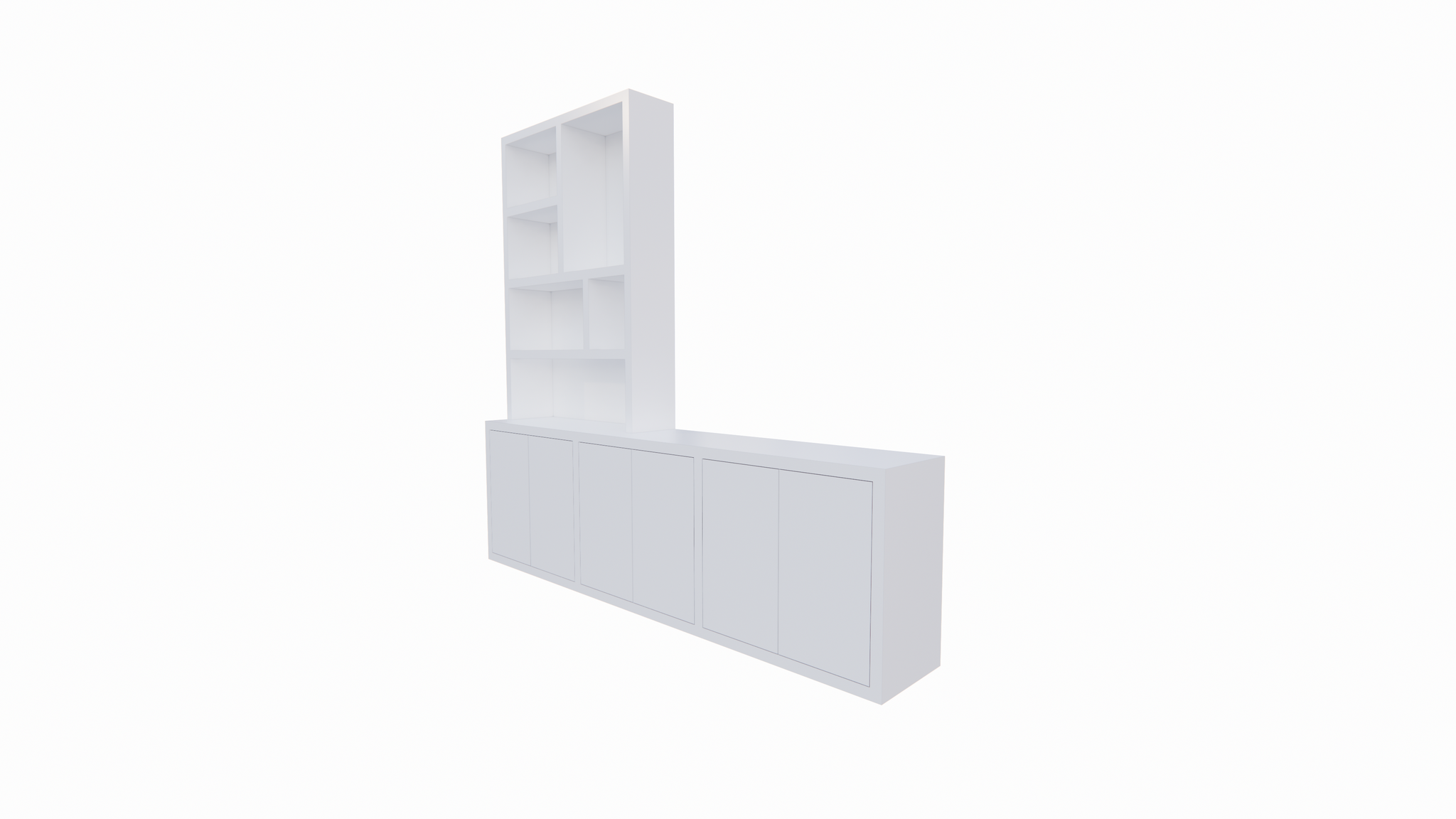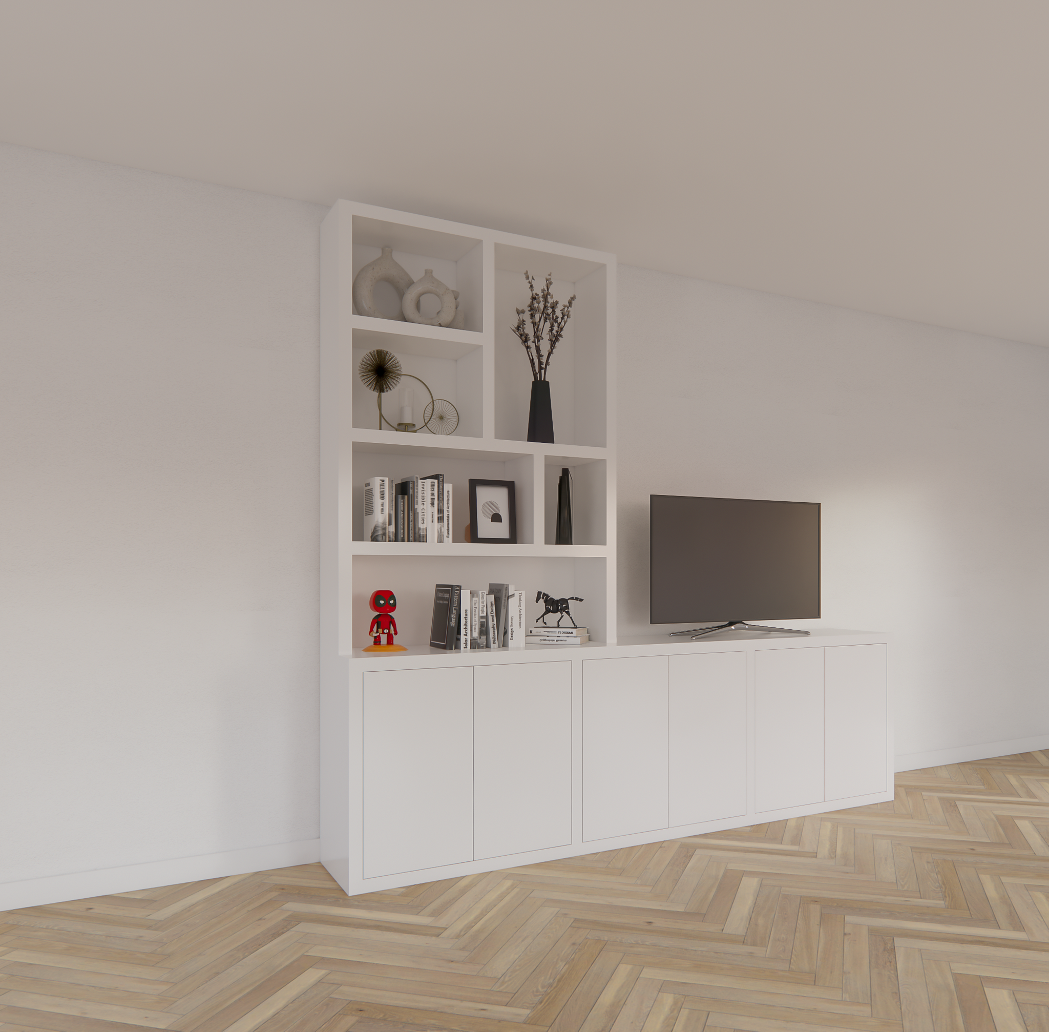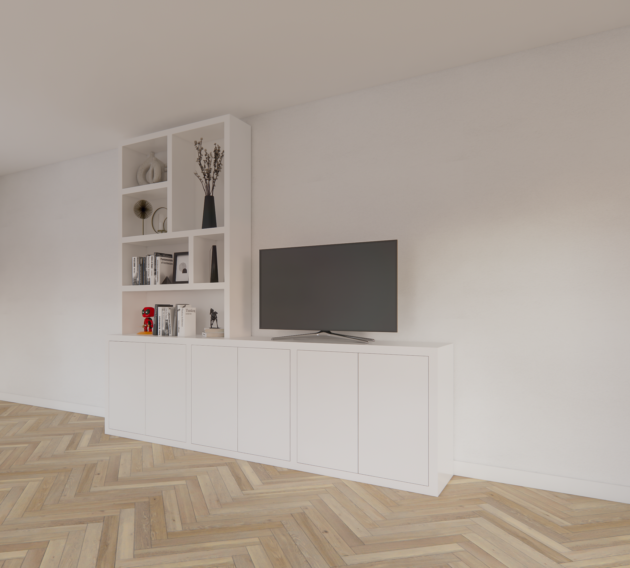 123kast  Tv dressoir Royan - 275x30/45x255H cm - 6 push to open deuren - vakkenkast gedeelte - strakke afwerking