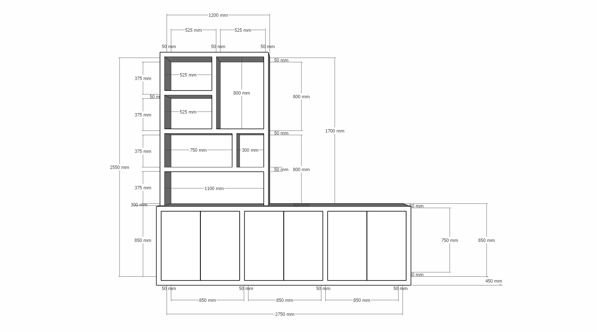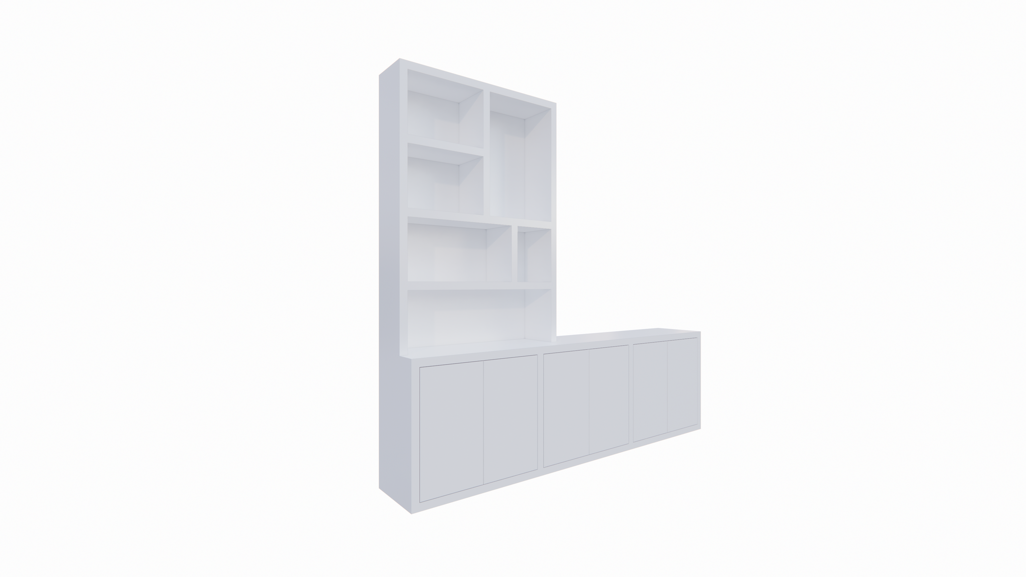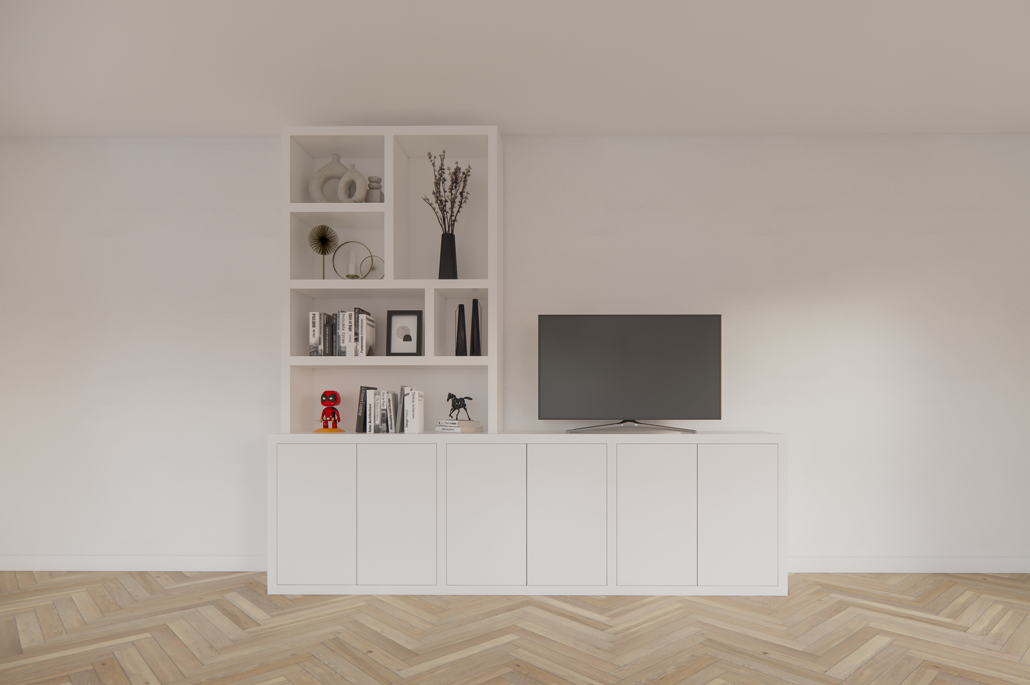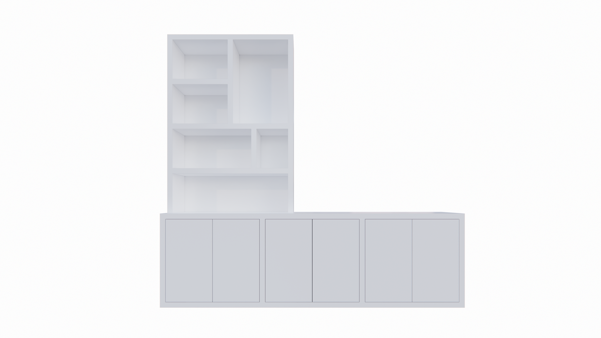 123kast  Tv dressoir Royan - 275x30/45x255H cm - 6 push to open deuren - vakkenkast gedeelte - strakke afwerking