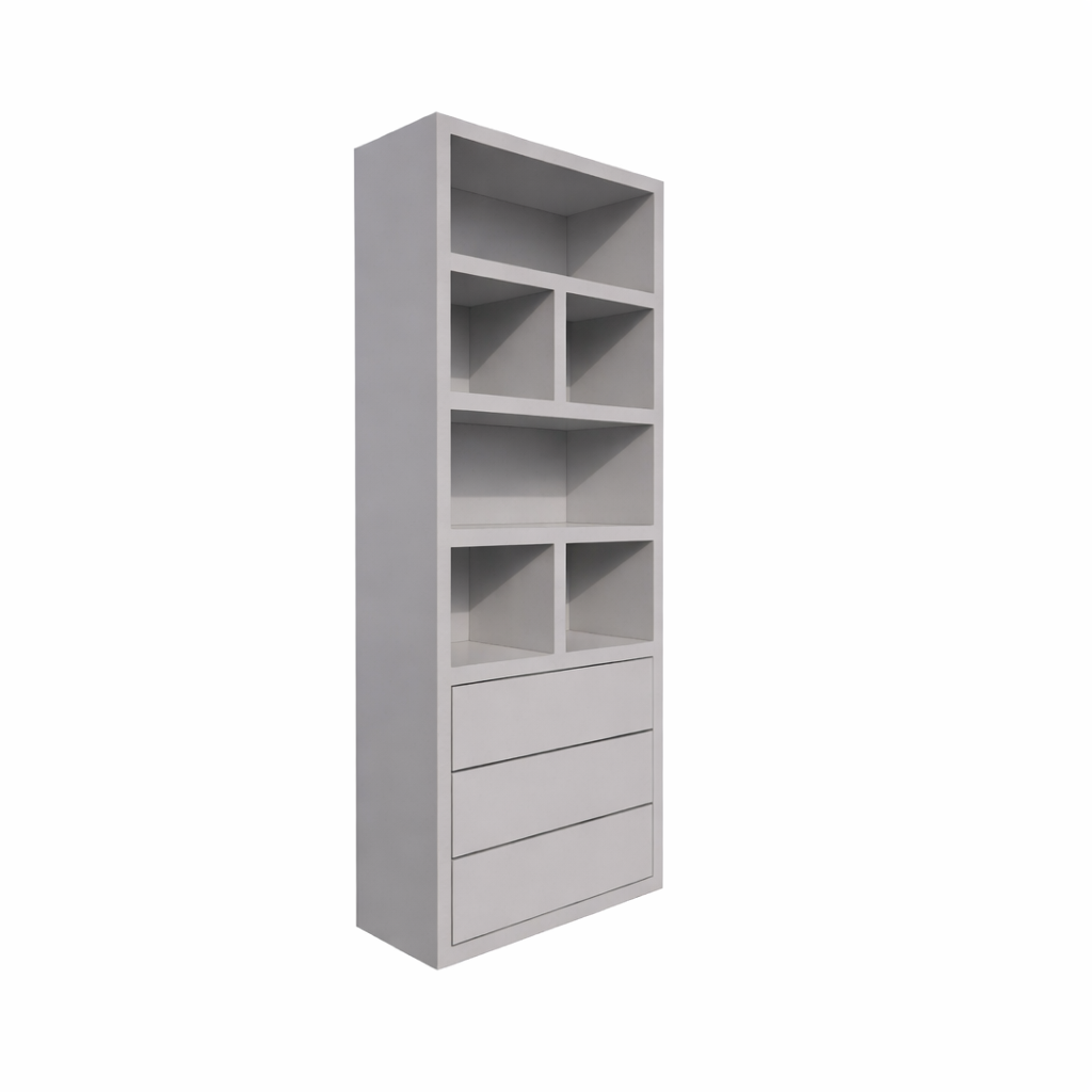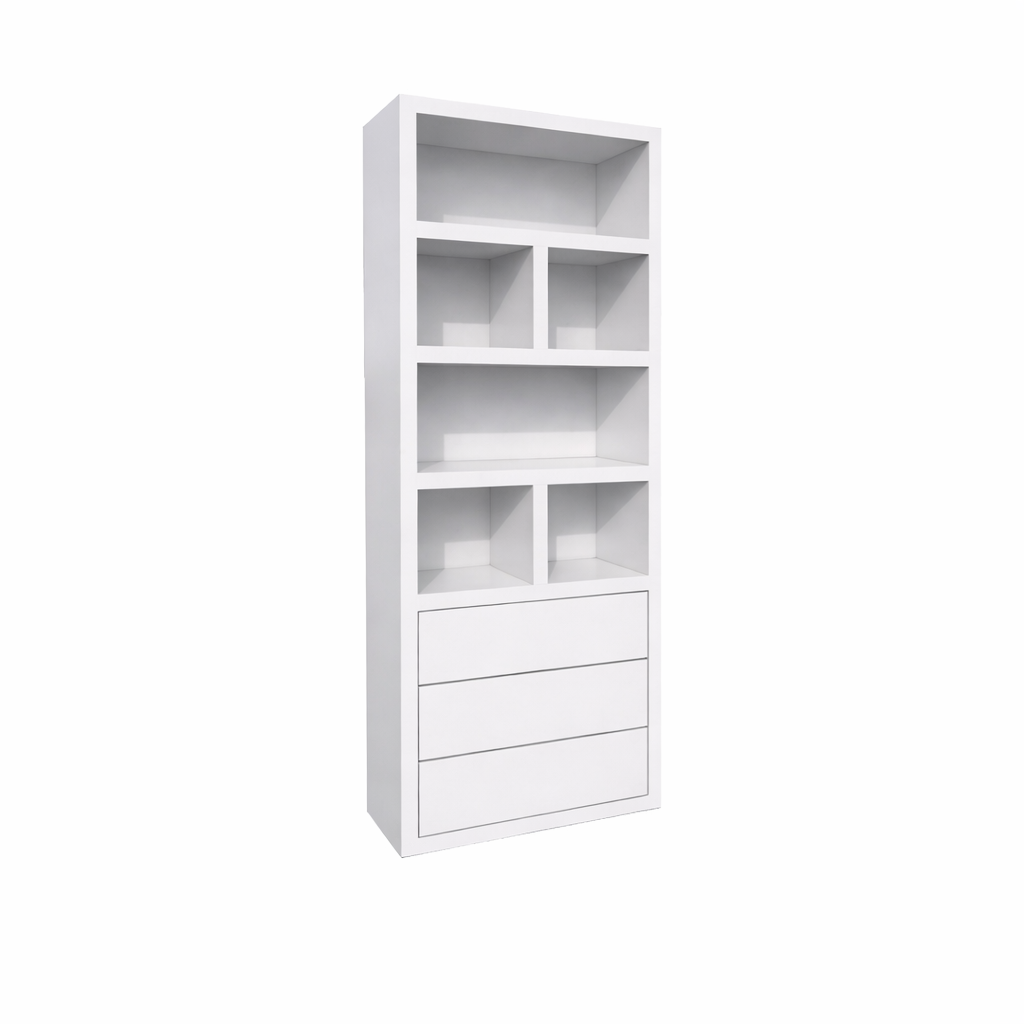 Vakkenkast Dallas - 90x40x230H cm - strak design - open vakken - 3 greeploze soft close lades - 5cm plank dikte