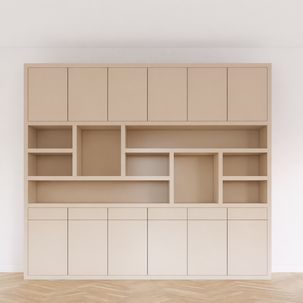 Vakkenkast Lanzarote 02 - 300x40x260H cm - push to open deuren - push to open lades - strakke afwerking
