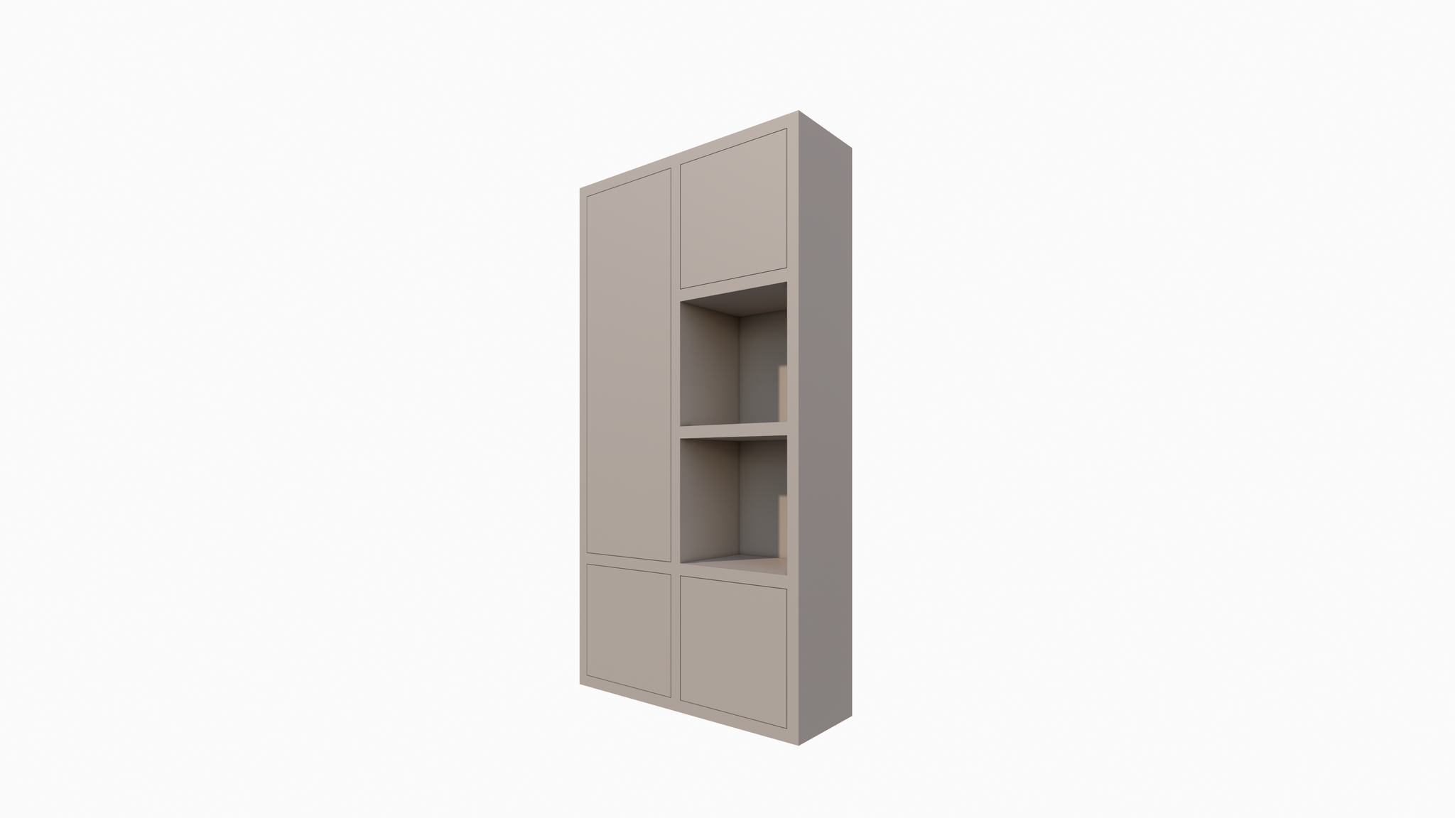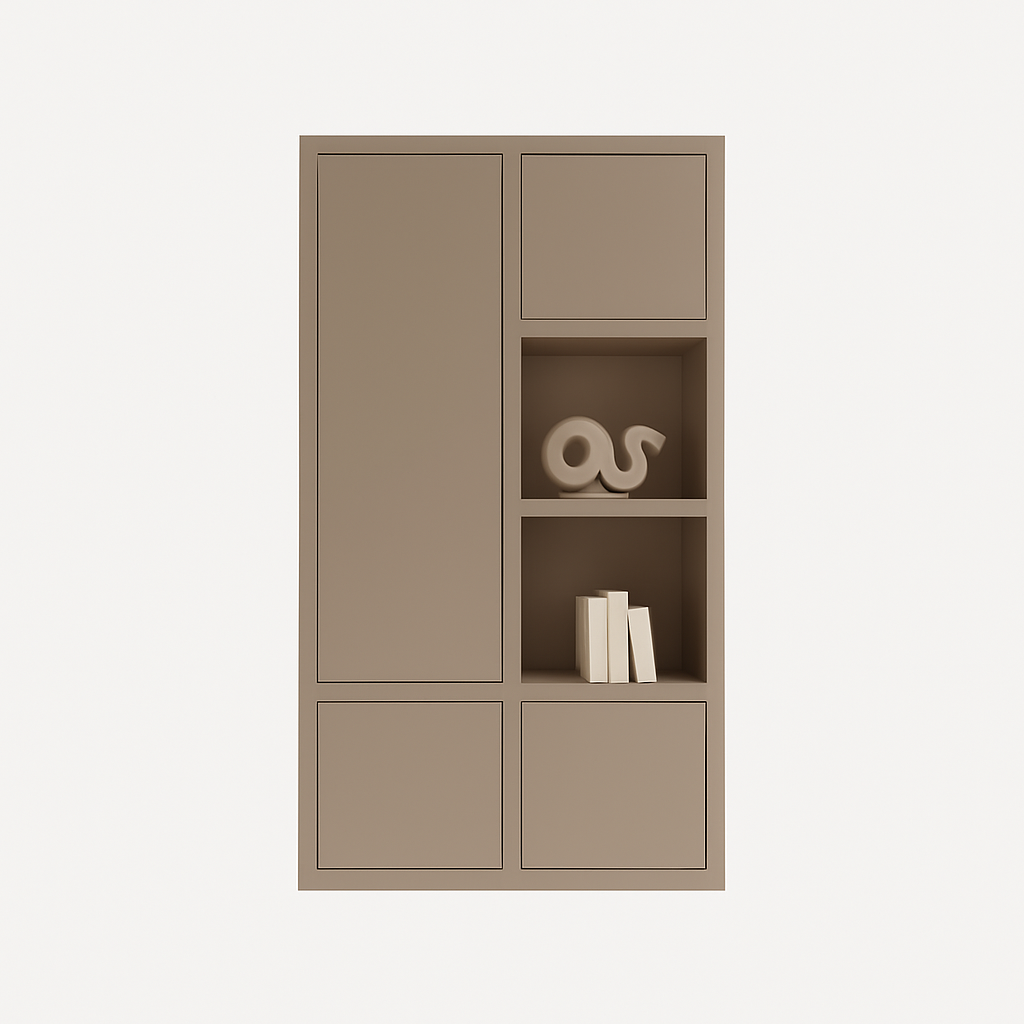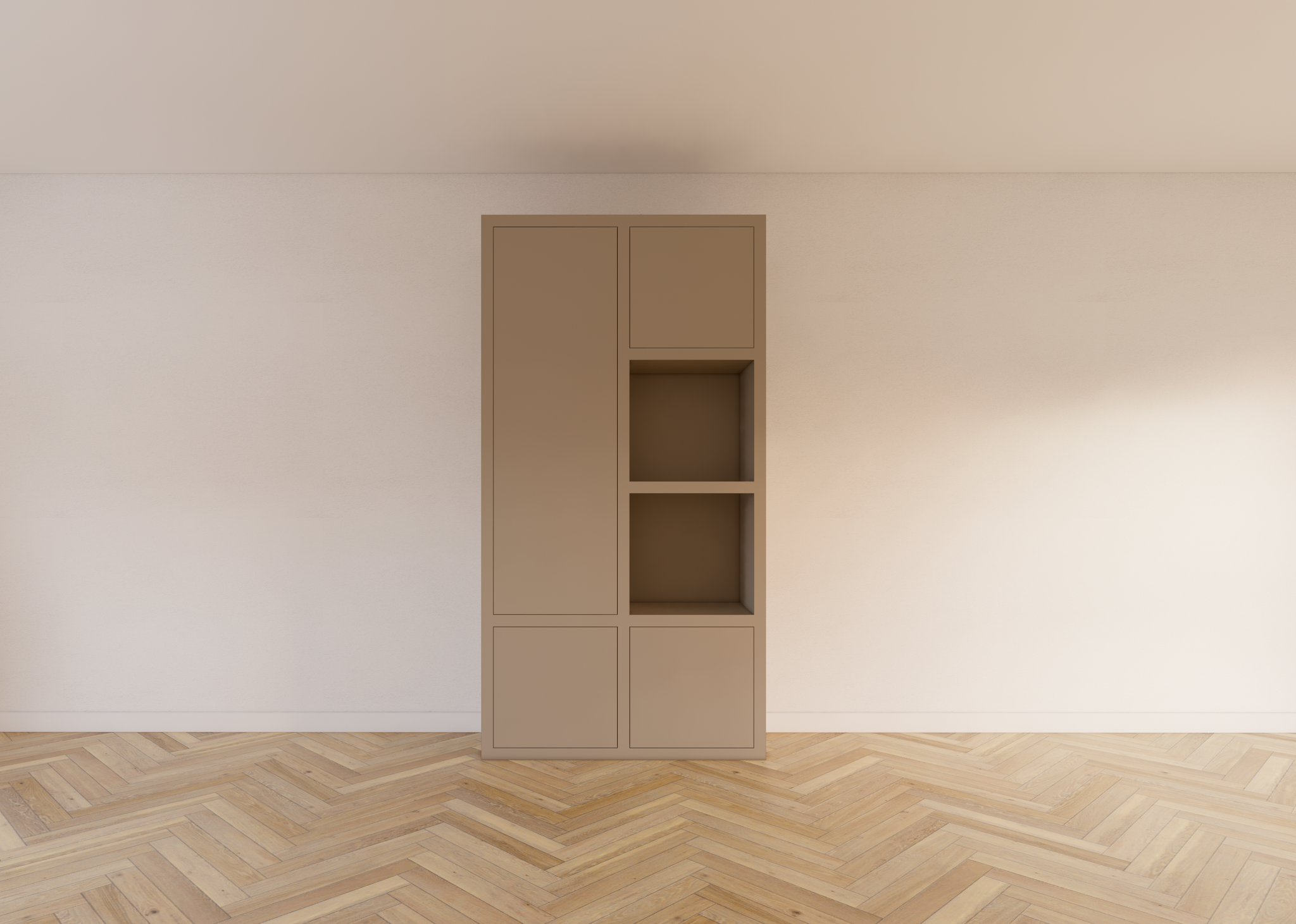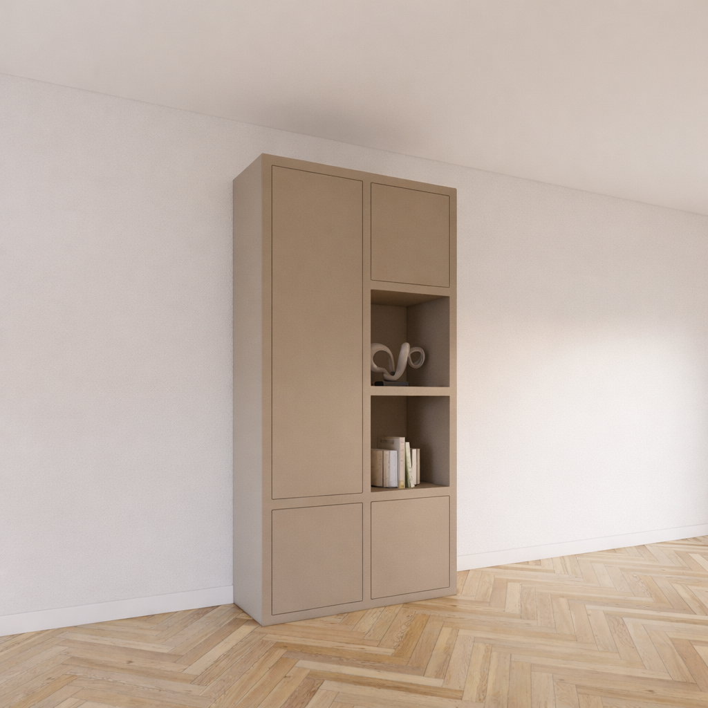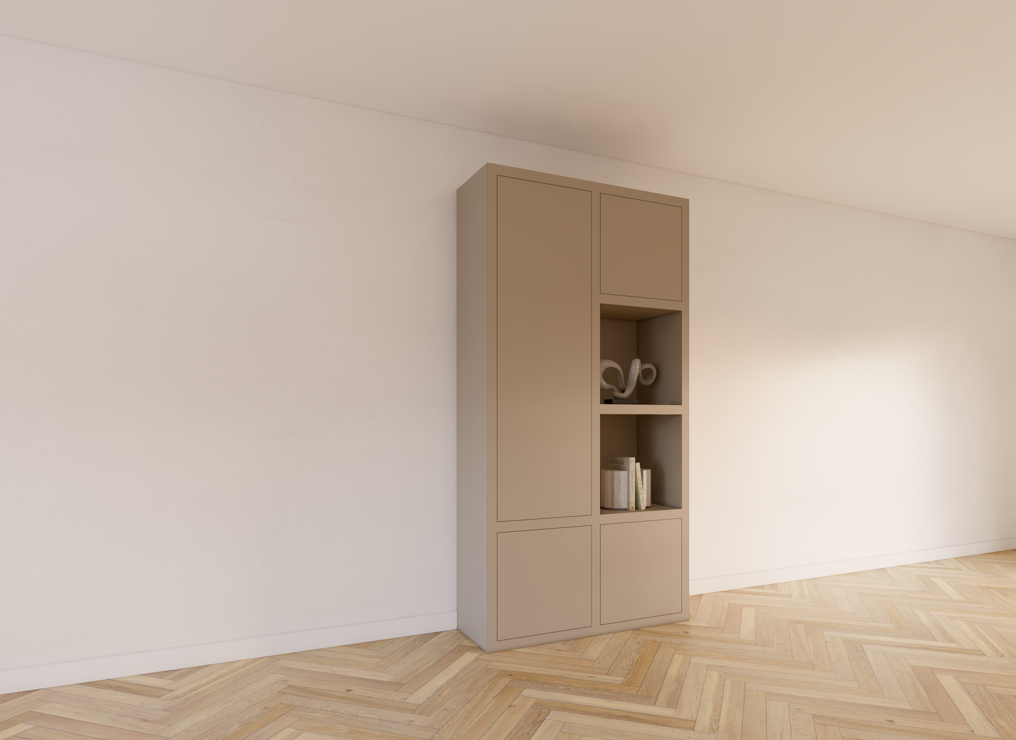 Opvallend detail zijn de planken met een dikte van 5 cm. Deze geven de kast extra body en zorgen voor een hoogwaardige, solide uitstraling. De uitvoering op de afbeelding is in de kleur NCS S 2005-Y50R, een zachte, warme beige-tint die prachtig samengaat met lichte interieurs.