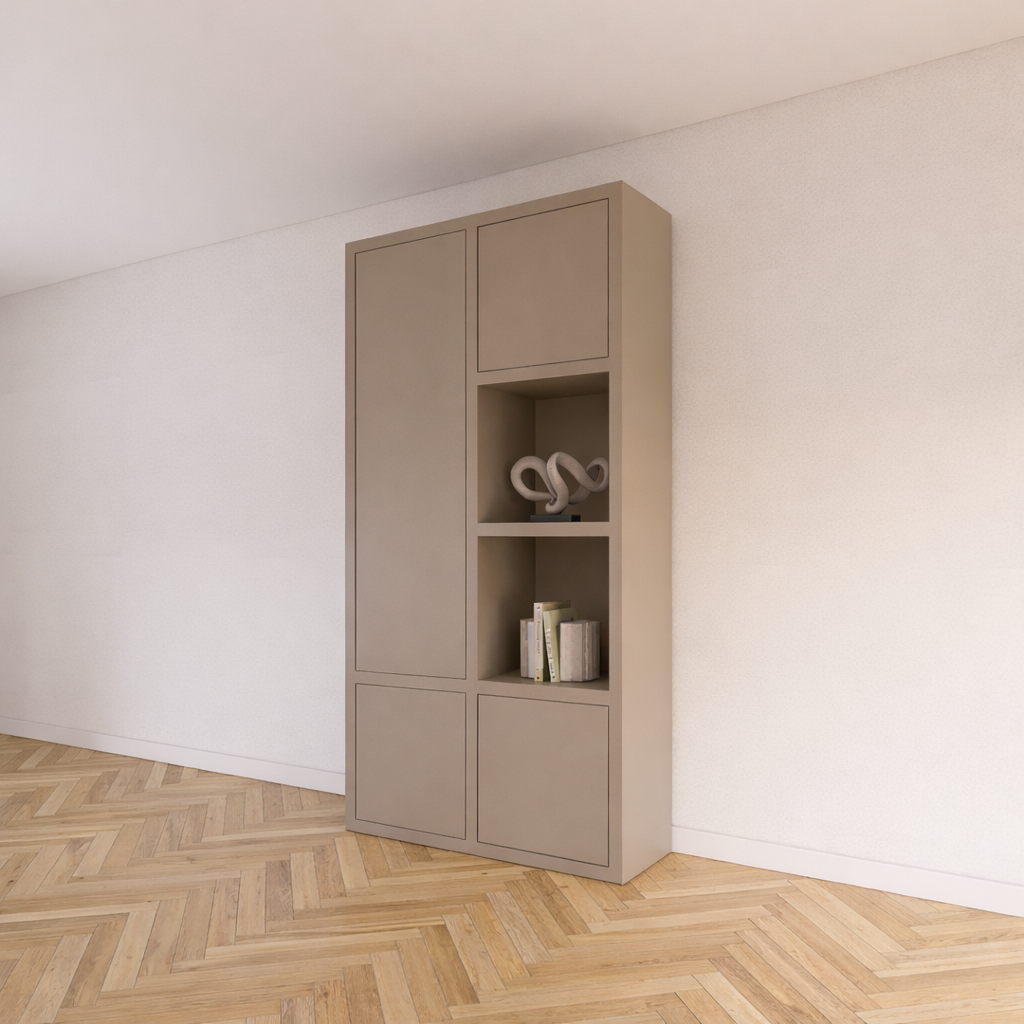 De kast is voorzien van greeploze push to open deuren, wat zorgt voor een strakke en egale uitstraling. De open vakken in het midden bieden ruimte voor boeken, decoratie of persoonlijke objecten. Door de combinatie van gesloten en open vakken blijft het meubel visueel interessant en toch rustig.