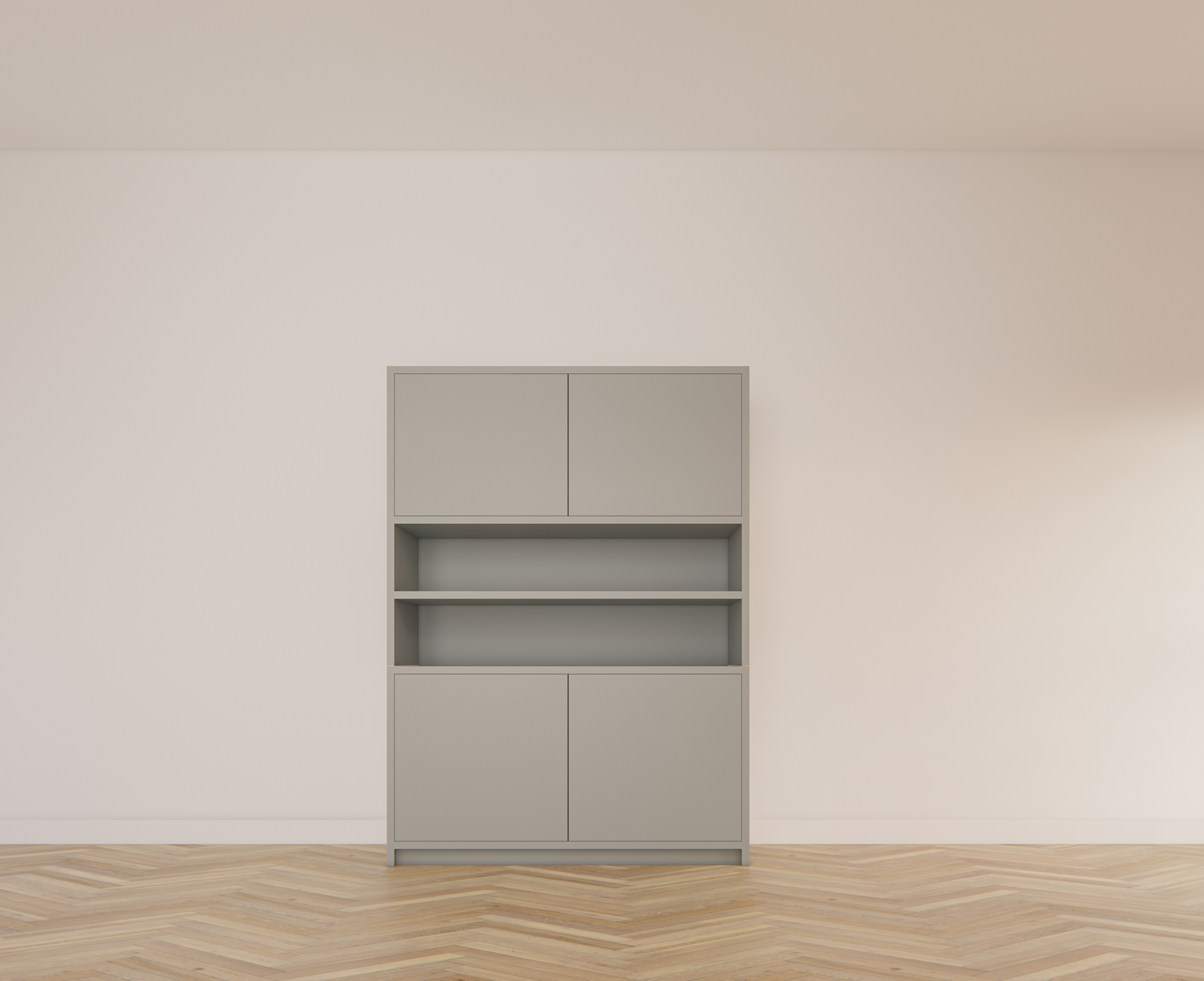De kast is voorzien van push to open deuren, waardoor je geen handgrepen nodig hebt en het design extra minimalistisch oogt. Het open vak in het midden geeft luchtigheid aan het geheel en is ideaal voor boeken, decoratie of persoonlijke eyecatchers.
