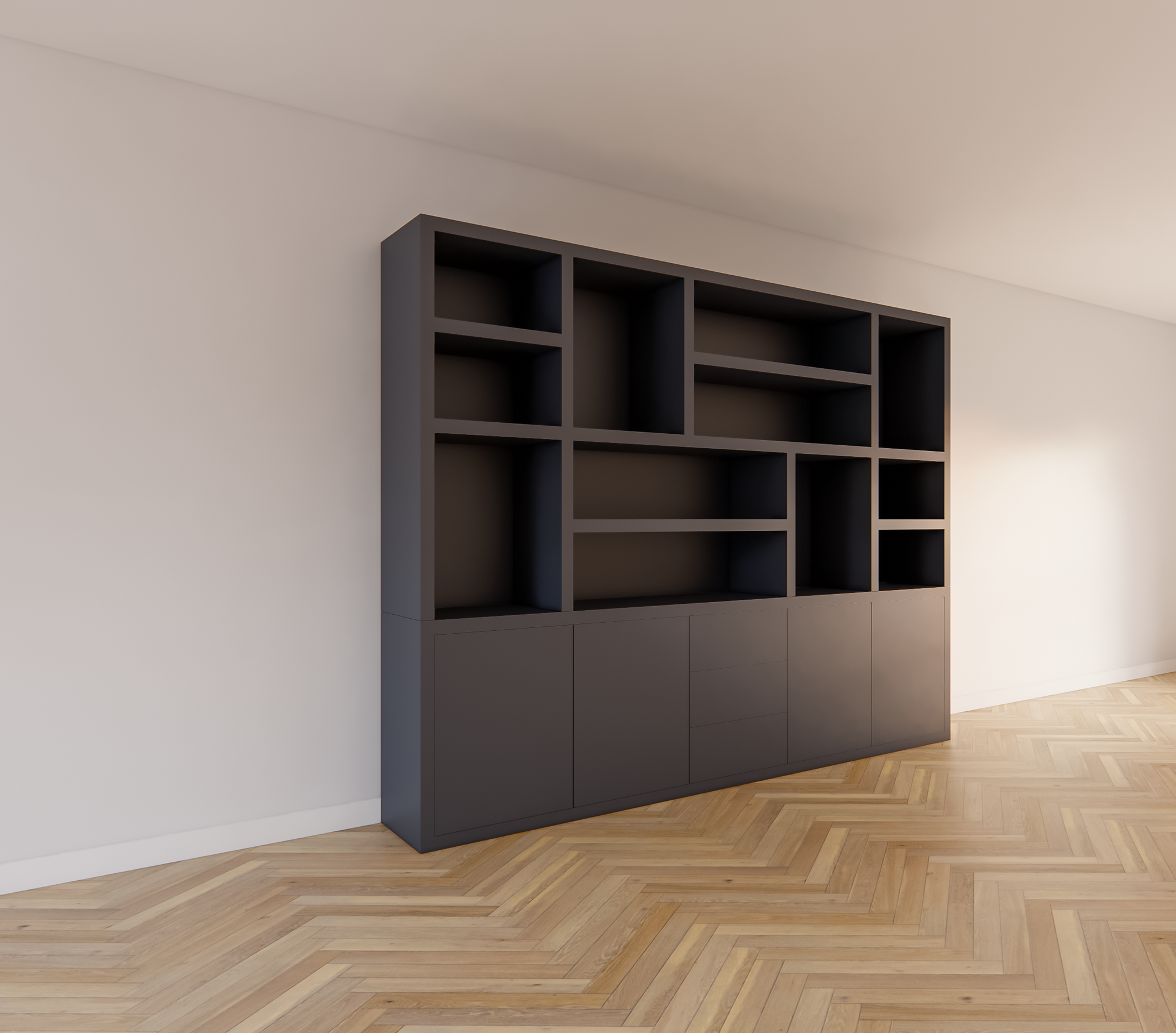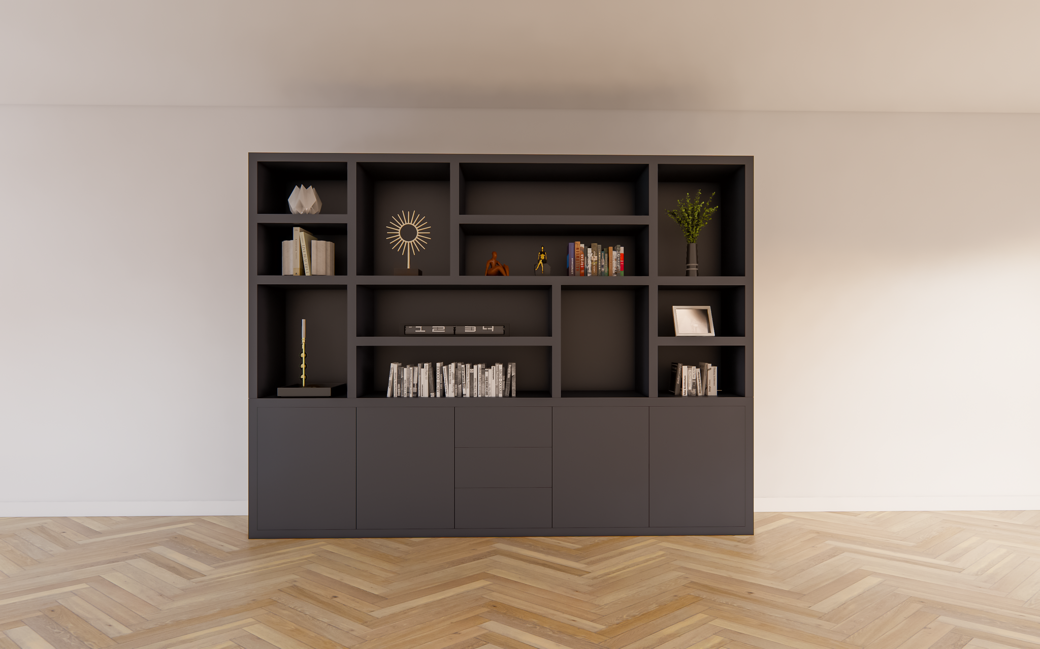 Door het greeploze ontwerp en de strakke belijning oogt de kast clean, maar zeker niet saai. De afwisseling tussen open en gesloten vakken geeft een speels, maar gebalanceerd effect.