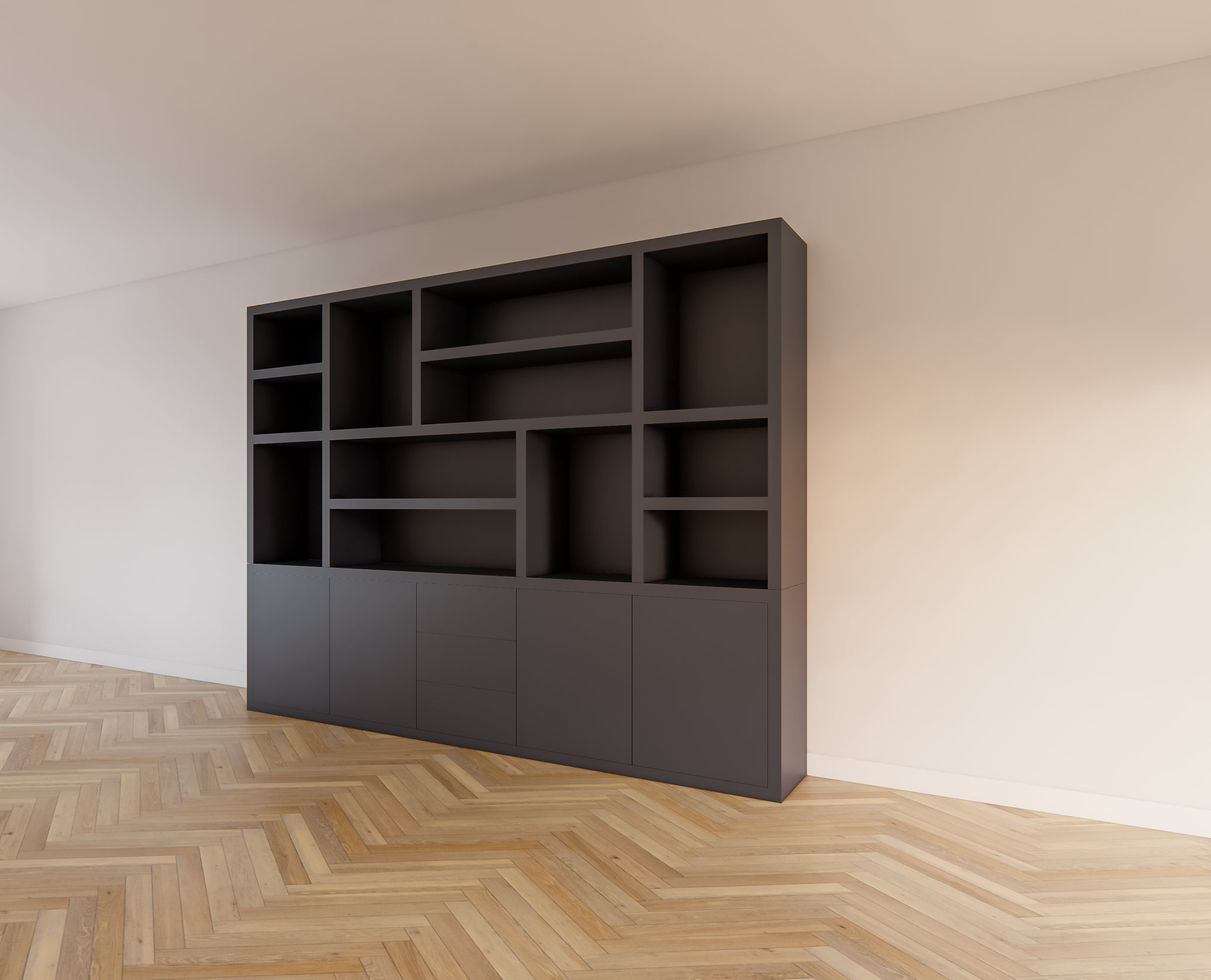 De Tolosa vakkenkast is het perfecte voorbeeld van modern design dat stijl en functionaliteit moeiteloos combineert. Met een breedte van 290 cm en een hoogte van 220 cm is dit een echte blikvanger in huis – ideaal voor de woonkamer, werkkamer of kantoor.