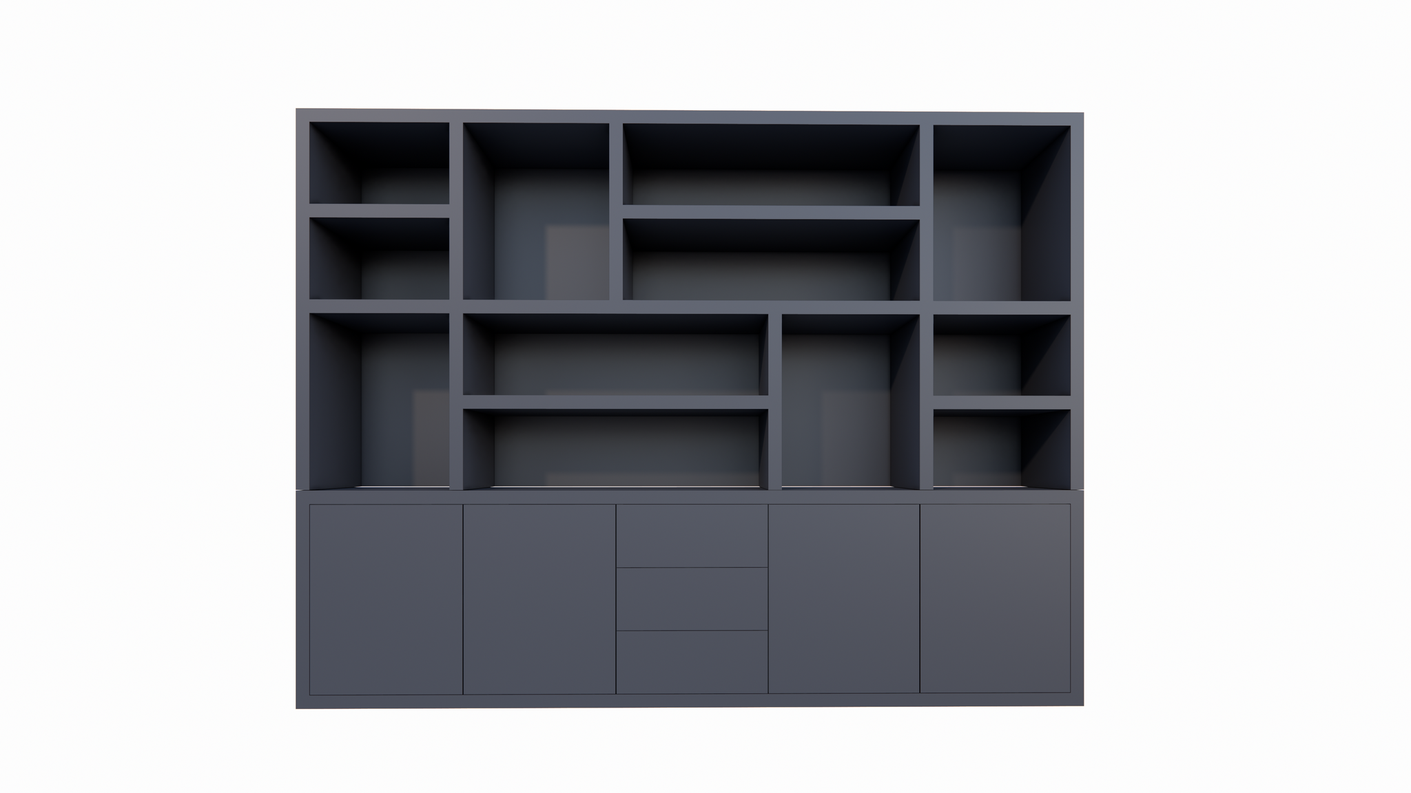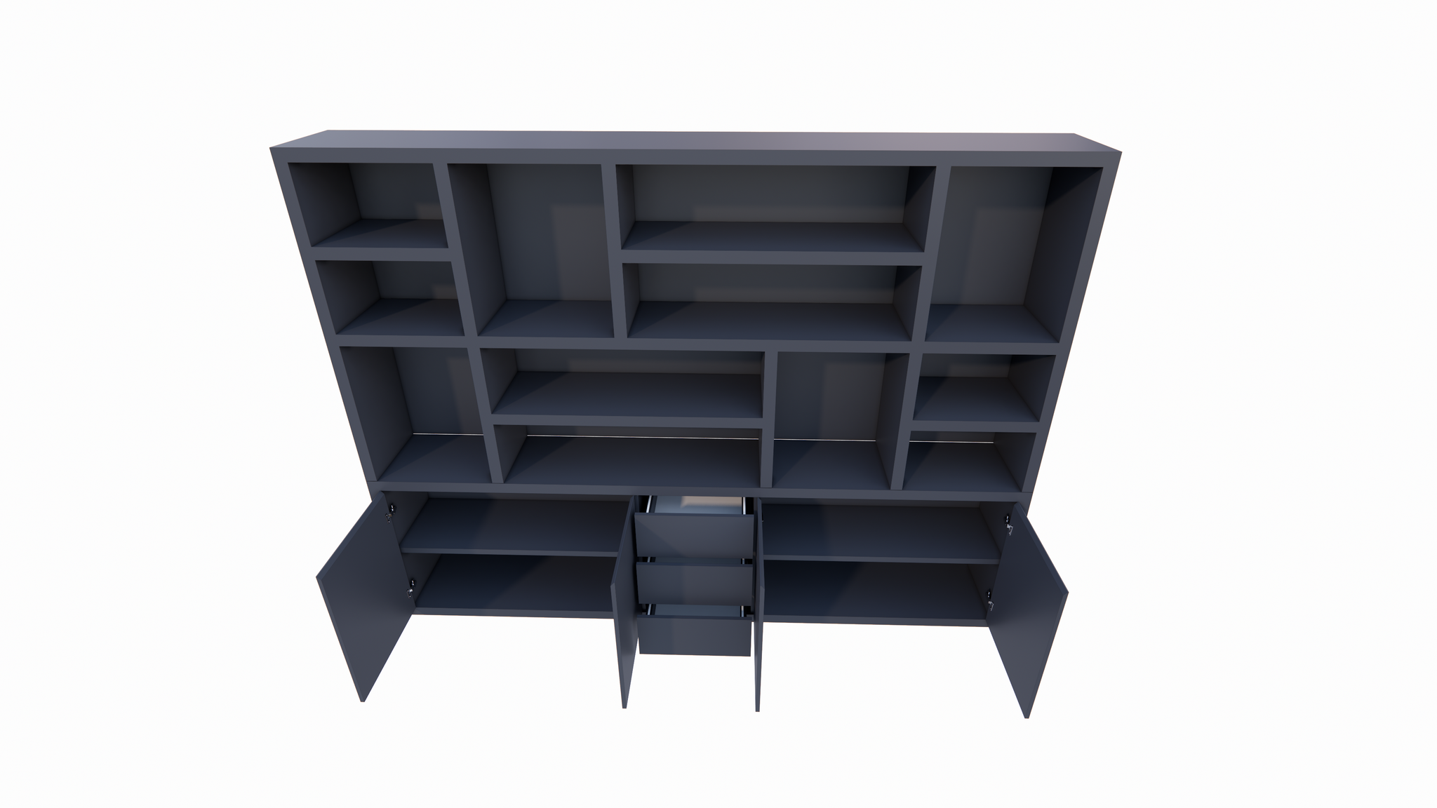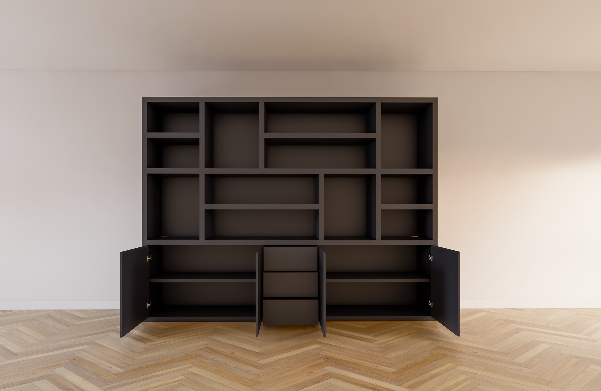 De kast heeft een moderne, rustige uitstraling dankzij het symmetrische open vakkenontwerp. Perfect om boeken, kunstobjecten of persoonlijke items een prominente plek te geven. Onderaan zorgen push-to-open deuren en lades voor handige opbergruimte – netjes weggewerkt, zonder zichtbare grepen.