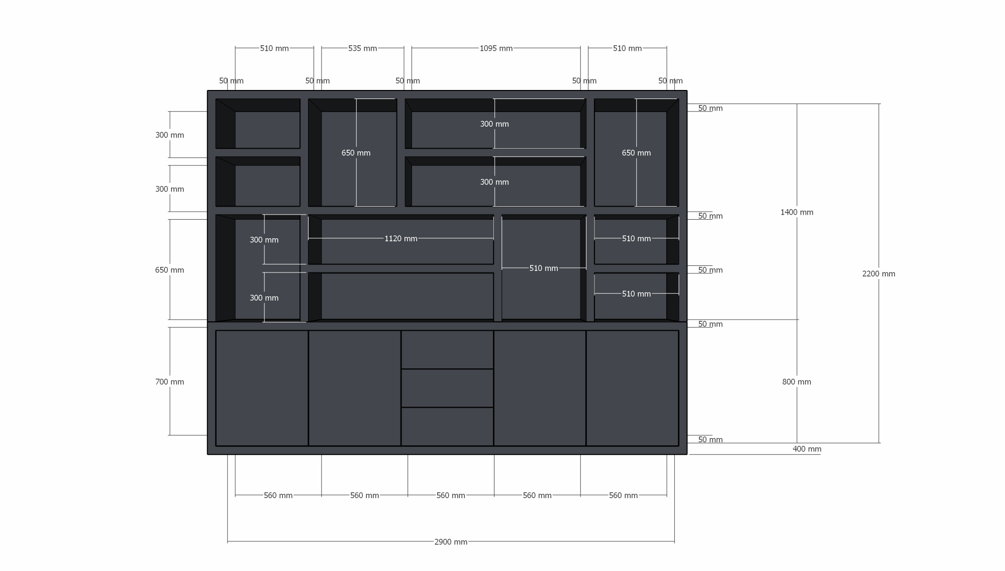 Vakkenkast Tolosa - 290x46x220H cm - open vakken- strak design - push to open lades en deuren