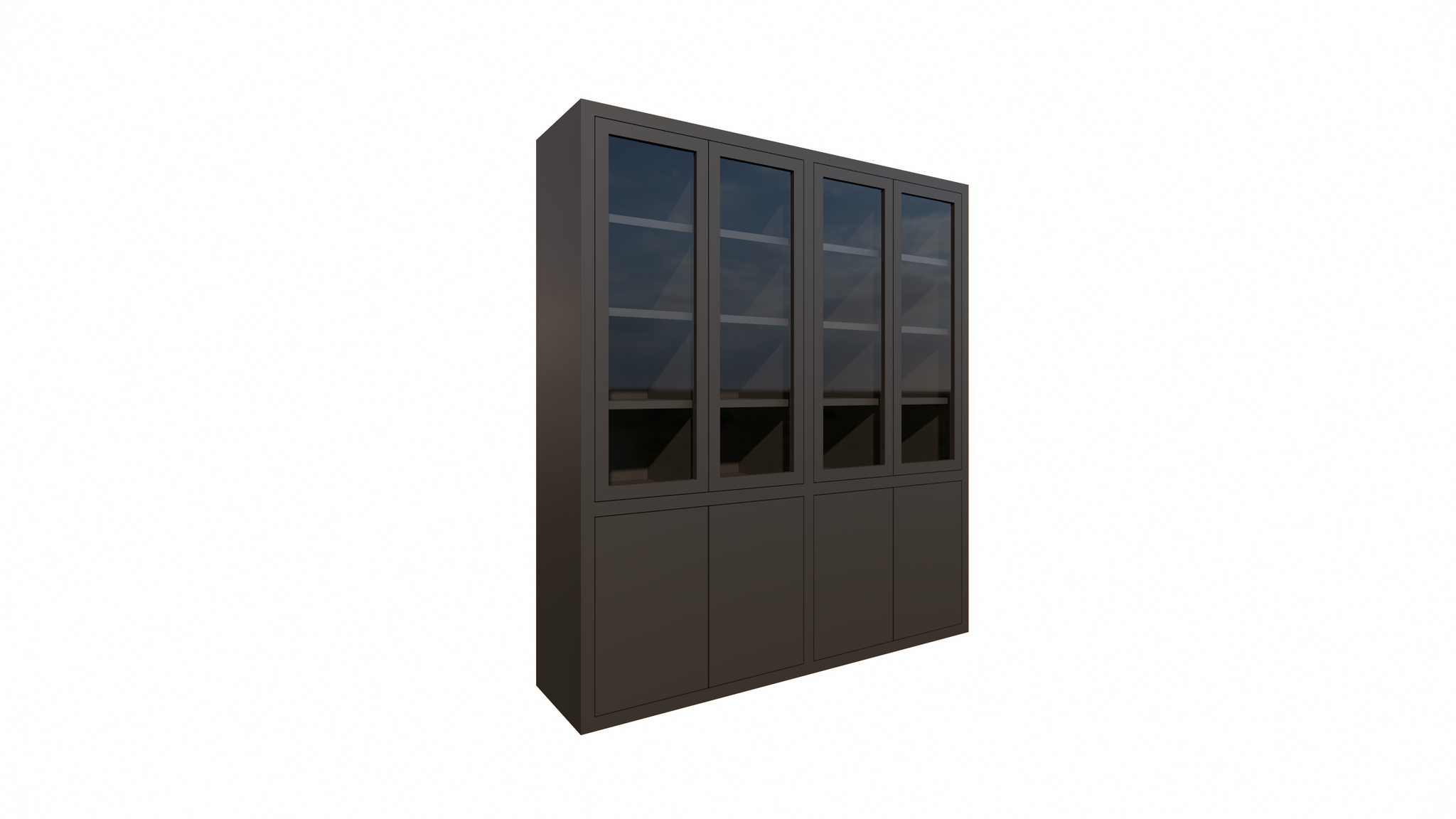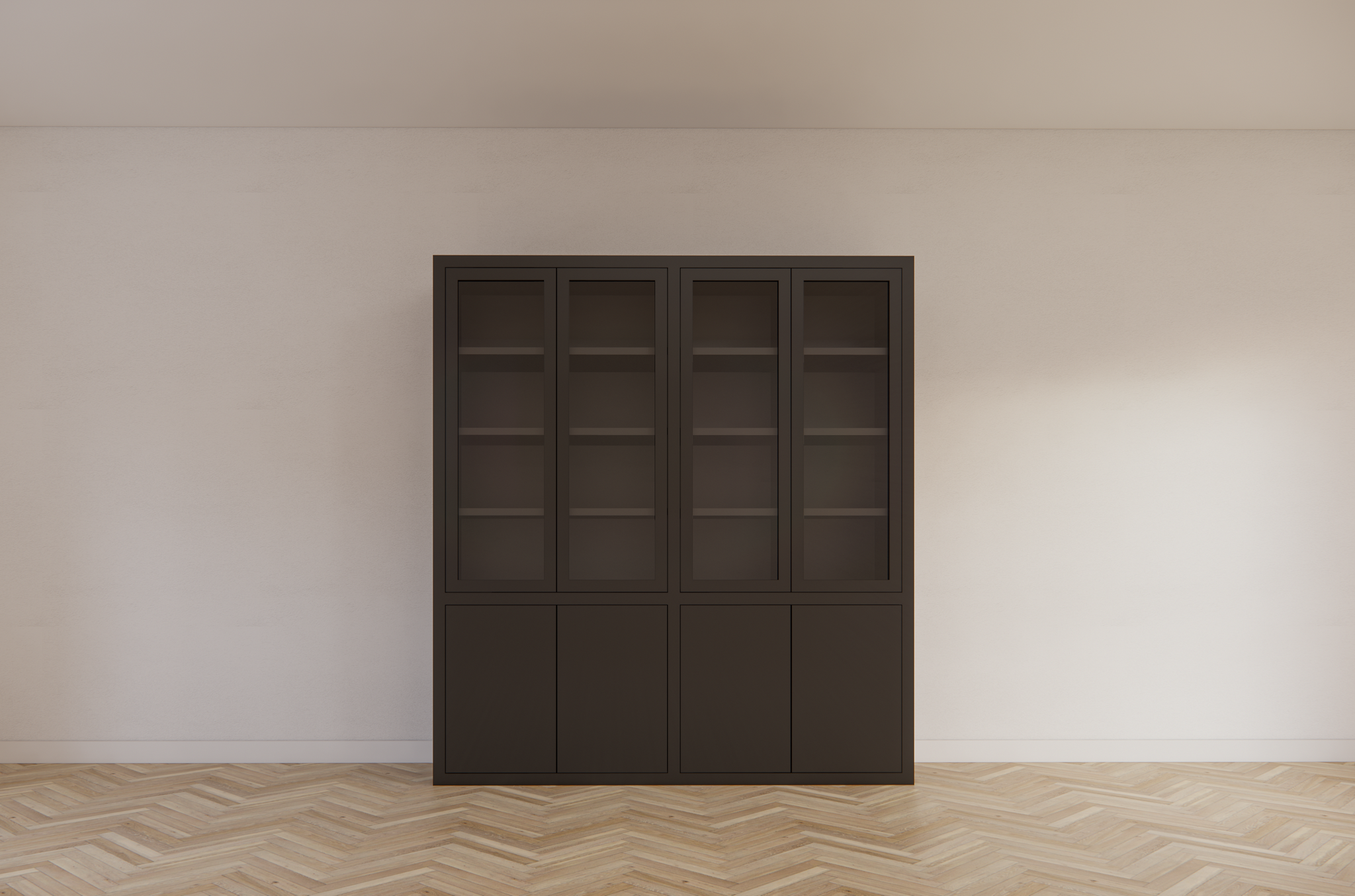 De Vitrinekast Bayonne biedt deuren met glas voor een lichte, open uitstraling, push to open systeem voor een strakke, handgrepless afwerking, op maat gemaakt en beschikbaar in alle RAL en NCS kleuren.