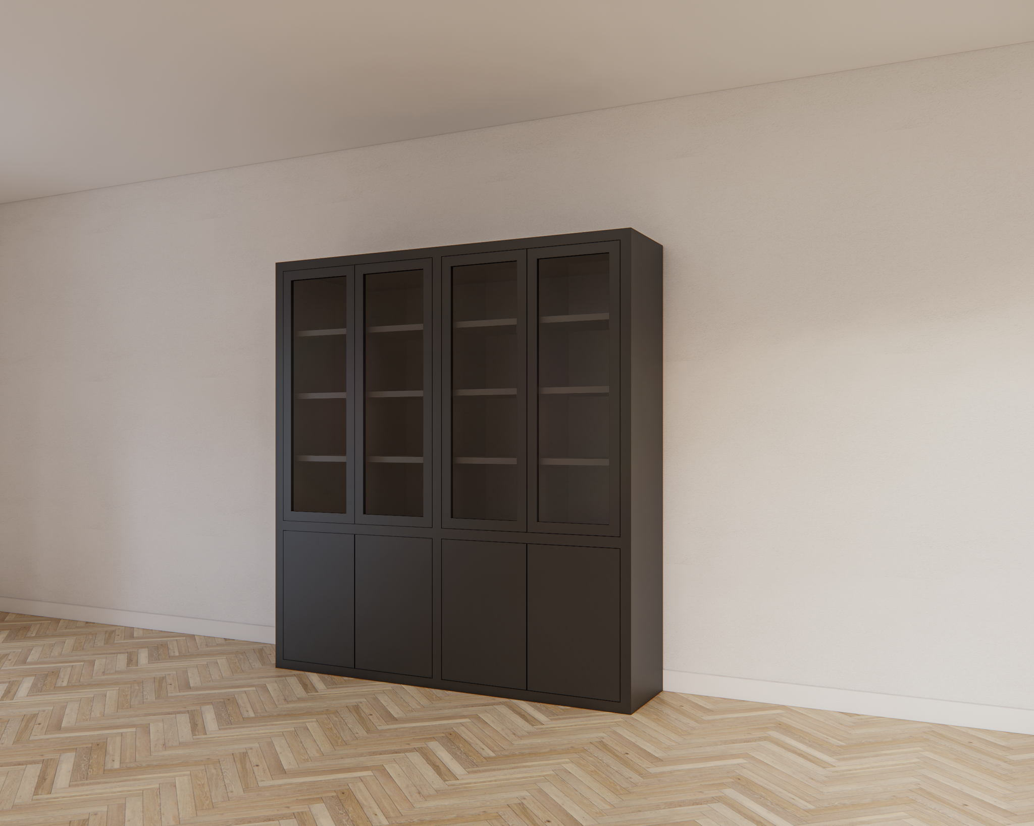 Vitrinekast Bayonne 200x50x220H cm, push to open deuren met glas, maatwerk en kleuren naar keuze.