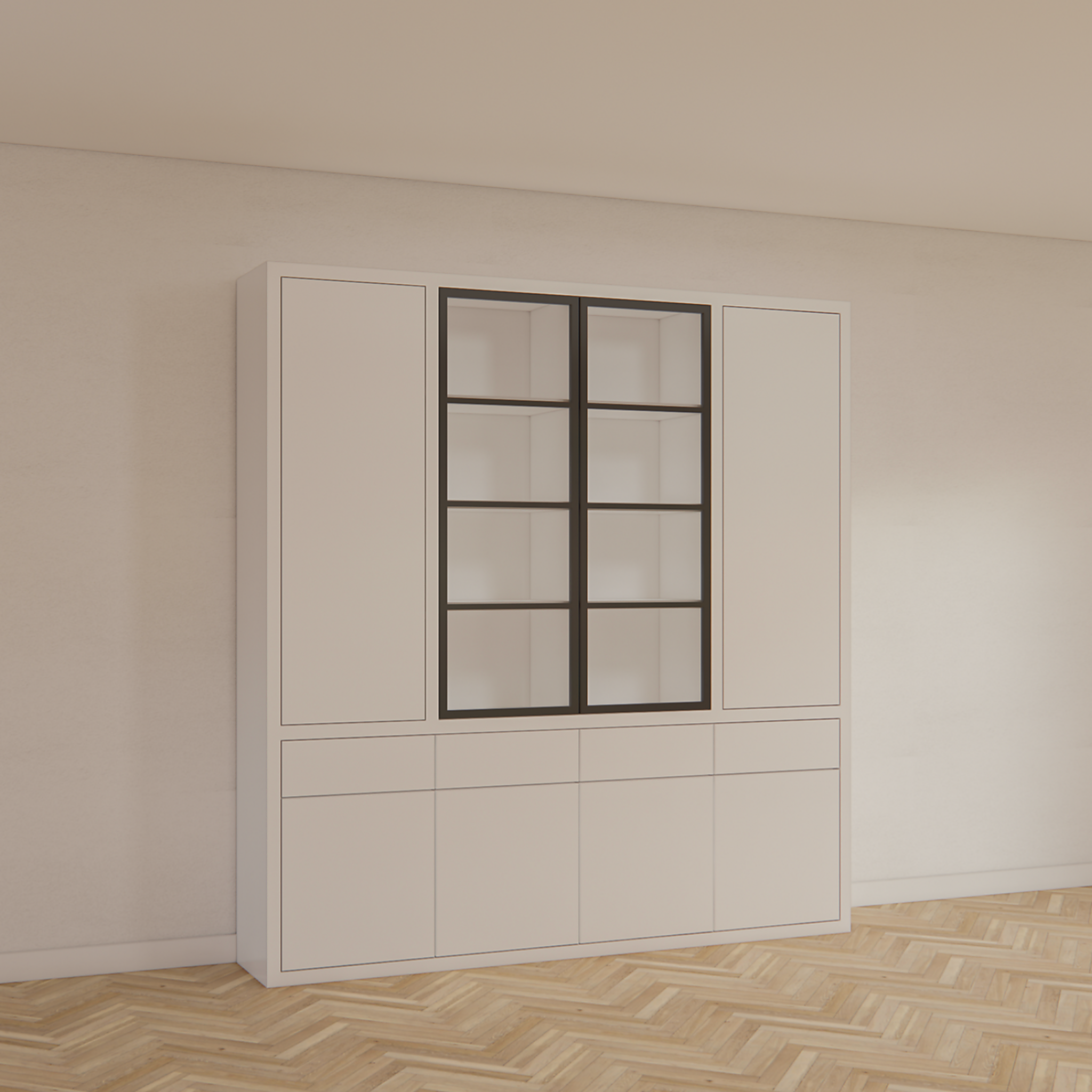 Wat deze vitrine echt bijzonder maakt, zijn de push-to-open deuren en lades die zorgen voor een naadloze, moderne afwerking. Zonder zichtbare handgrepen behoudt de kast een strakke en minimalistische uitstraling. De stalen glazen deuren geven de kast een industrieel-chique look, terwijl ze de mogelijkheid bieden om de inhoud op een elegante manier tentoon te stellen. Het staal en het glas vormen samen een prachtig contrast dat perfect past in een hedendaags interieur.