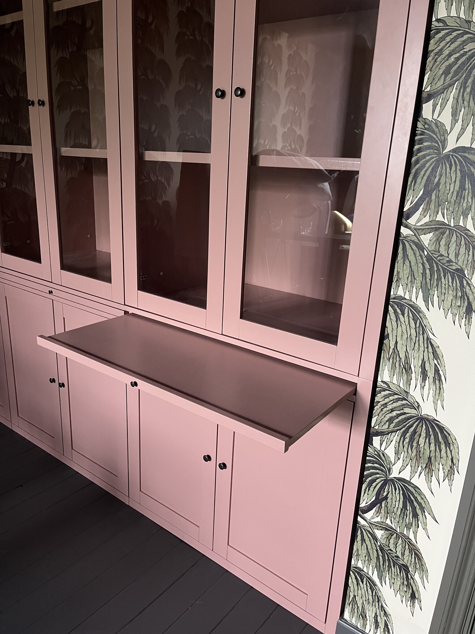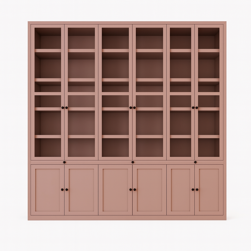 De bovenkant van de kast is voorzien van glazen scharnierdeuren, waardoor je servies, boeken of decoratie prachtig zichtbaar blijven. Extra praktisch zijn de uitschuifbare planken, ideaal om spullen makkelijk te bereiken of om een speelse indeling te maken.