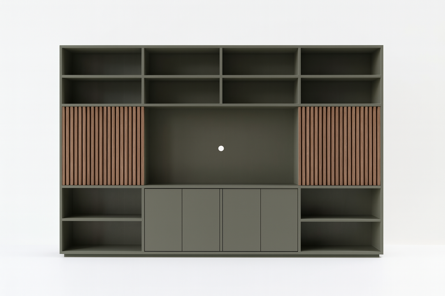 Het betreft een maatwerkkast met een ruim TV-vak, open vakken en een dichte onderkast, uitgevoerd in de kleur NCS S 3010-G10Y.