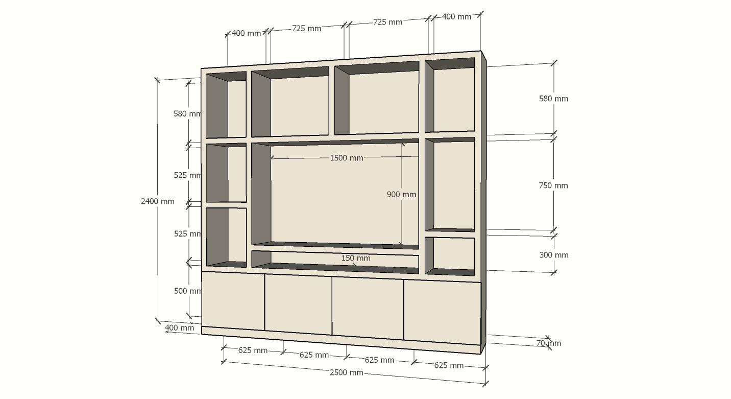 Voorraad TV vakkenkast Jose - 250x40x240H cm - RAL 9001 - 10 open vakken - 4 push to open deuren - 5cm plank dikte