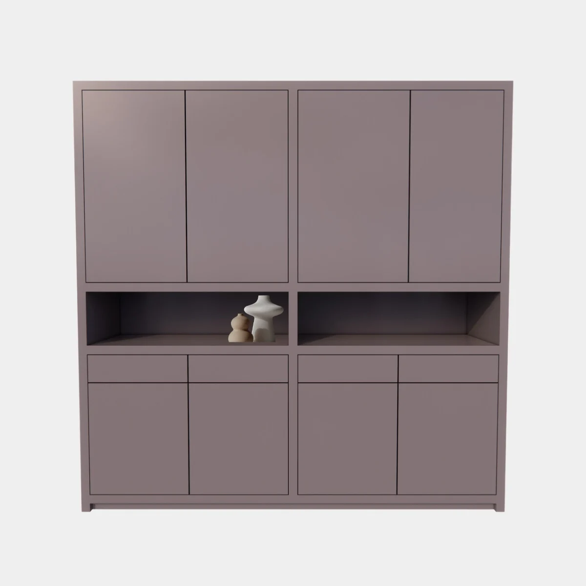 Het ontwerp bestaat uit een combinatie van dichte opbergruimte en twee open vakken, uitgevoerd in een rustige, tijdloze RAL 9010-kleur. Dankzij de diepe onderkasten biedt dit model veel functionele opbergruimte, terwijl de strakke lijnen zorgen voor een moderne uitstraling.